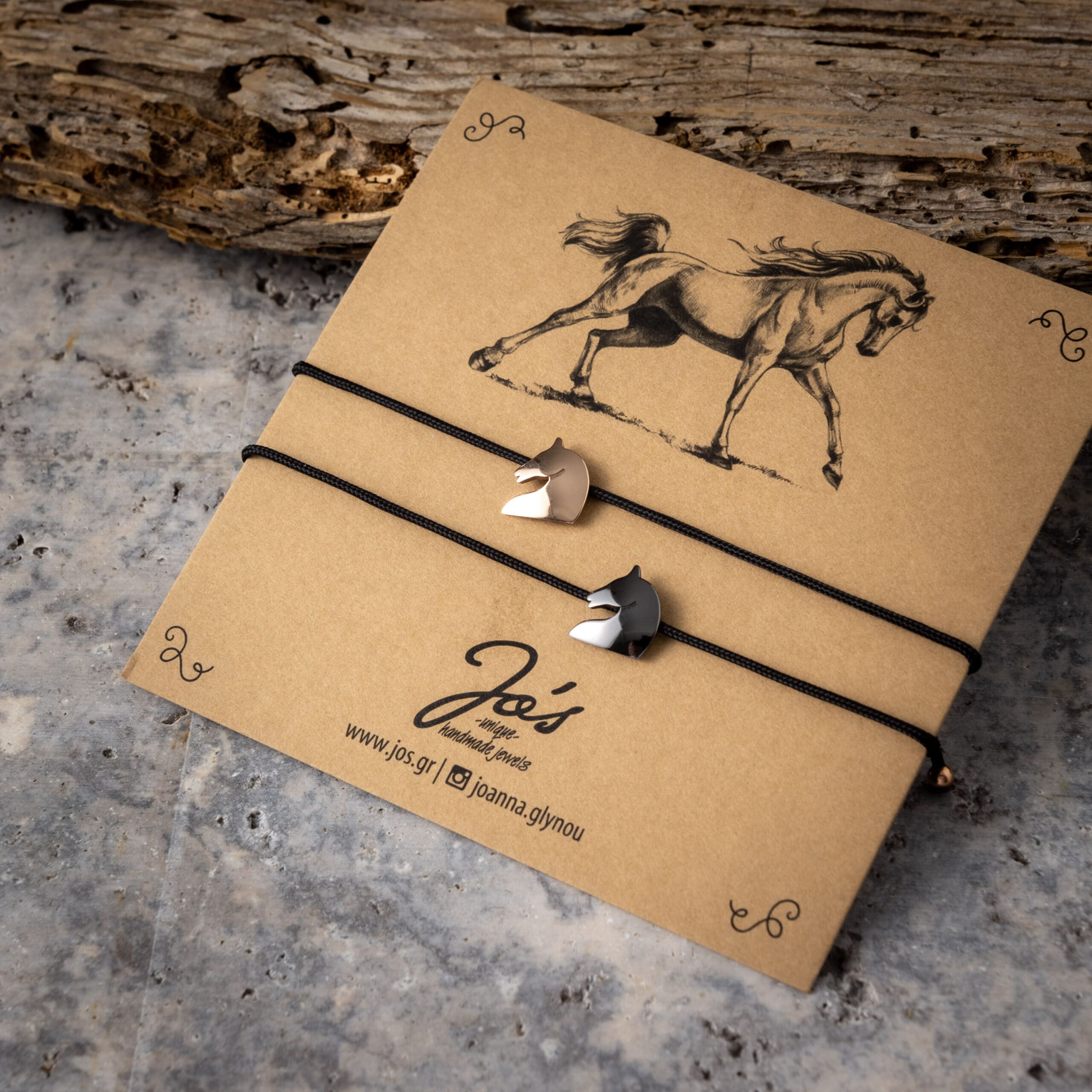 Braccialetto in corda con ciondolo in argento raffigurante la testa di un cavallo.
