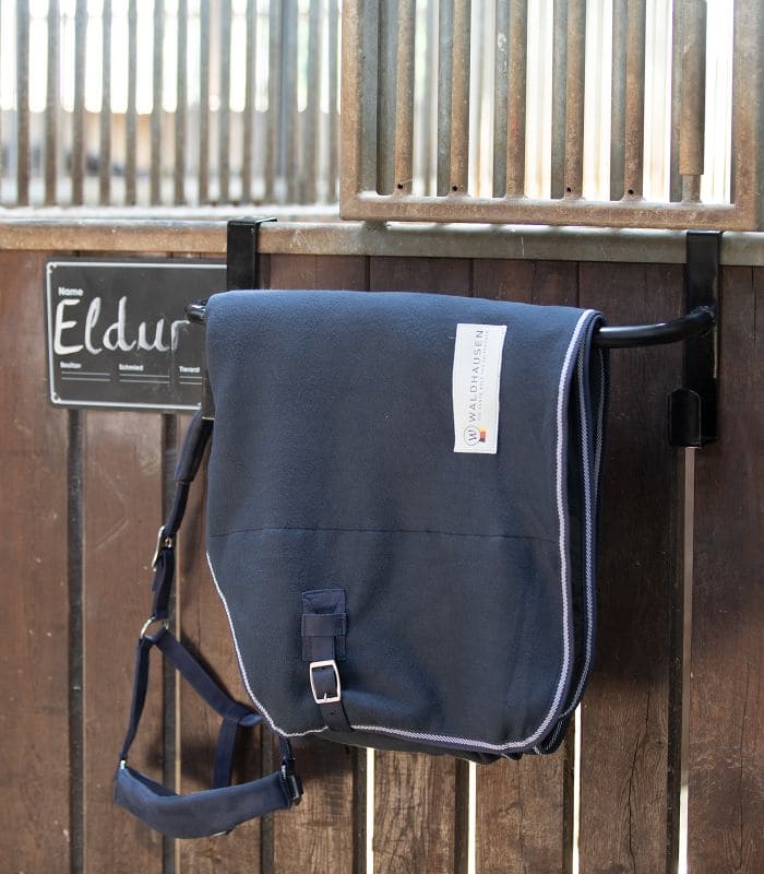 L'appendicoperte si appende facilmente alla porta del box senza ausilio di viti o fori. Possiede 2 comodi supporti per riporre la capezza o le briglie.