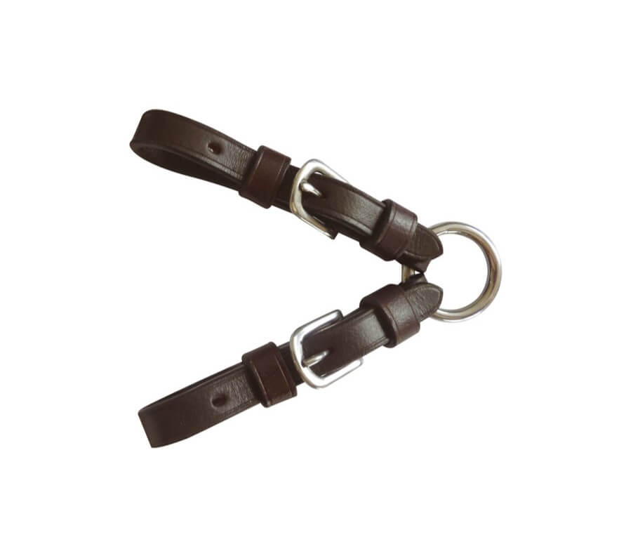 Guarnizioni per pelham in pelle di bufalo con anelli centrali per attacco redini. Fibbie per imbracatura in acciaio inossidabile.