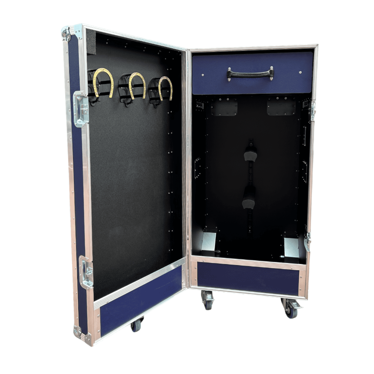 Baule da concorso per 2 selle inglesi rivestito esternamente in laminato plastico goffrato ideale per essere utilizzato in scuderia e in concorso grazie alle sue comode ruote e maniglie.