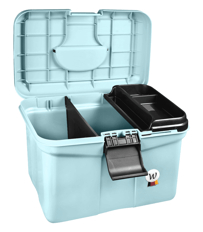 Valigetta per kit di pulizia con maniglia pieghevole, chiusura a scatto, divisorio regolabile in due posizioni e scomparto estraibile.