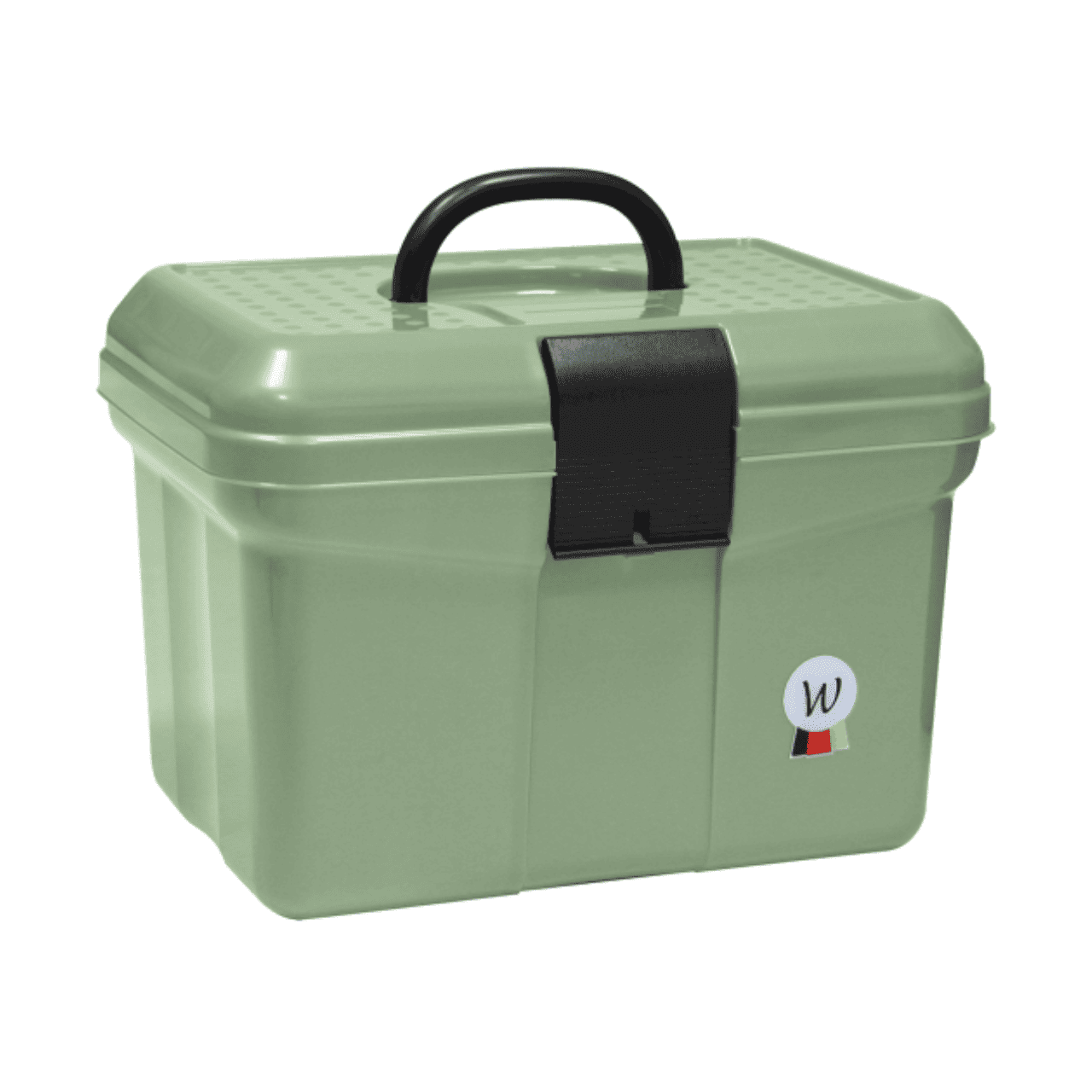 Valigetta per kit di pulizia con maniglia pieghevole, chiusura a scatto, divisorio regolabile in due posizioni e scomparto estraibile.