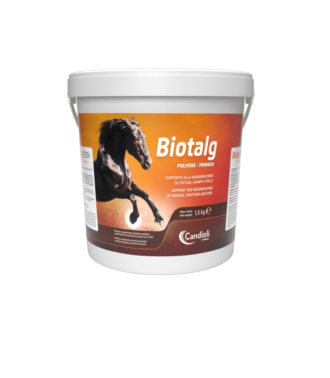 Il Biotalg Candioli è un ottimo prodotto a base di biotina per la crescita dello zoccolo. Fornisce biotina in elevata concentrazione per stimolare una rapida ed uniforme crescita dell'unghia; indispensabile nei disturbi di accrescimento del tessuto corneo. Stimola una rapida e corretta crescita dello zoccolo, ed è particolarmente indicato nei casi fragilità della parete, disturbi dell'accrescimento del tessuto corneo o alterazioni della linea bianca tra parete e suola dello zoccolo.