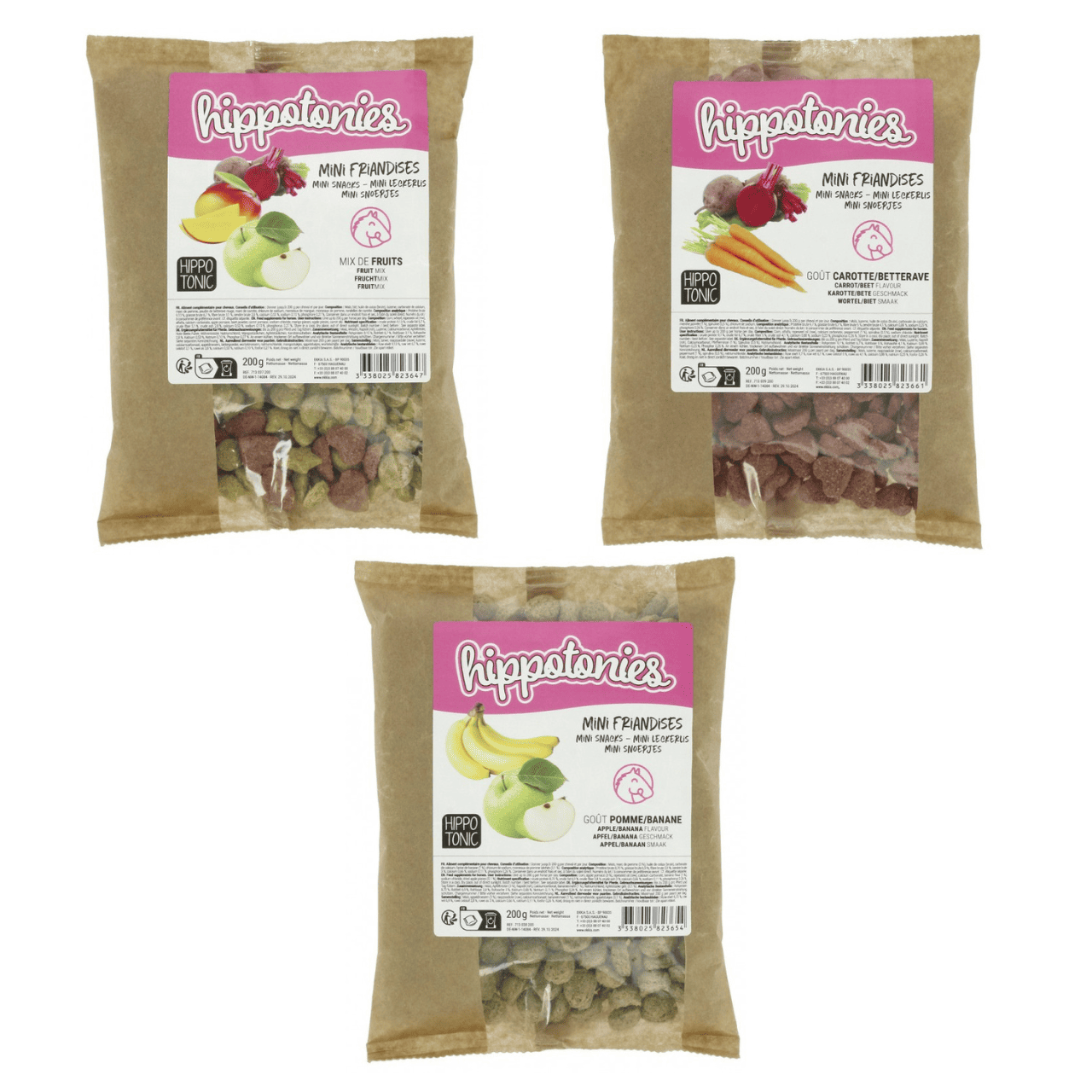 Biscotti in formato 'mini' per cavalli al gusto mela in confezione da 200 grammi.