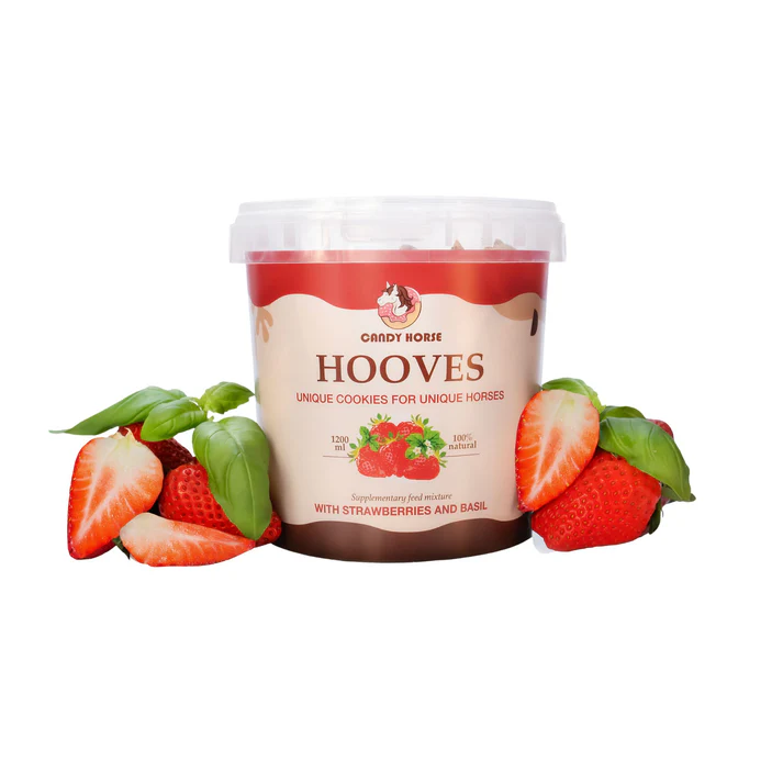 Secchiello di biscotti artigianali per cavalli al gusto speciale di fragola e basilico, completamente privi di zuccheri aggiunti.