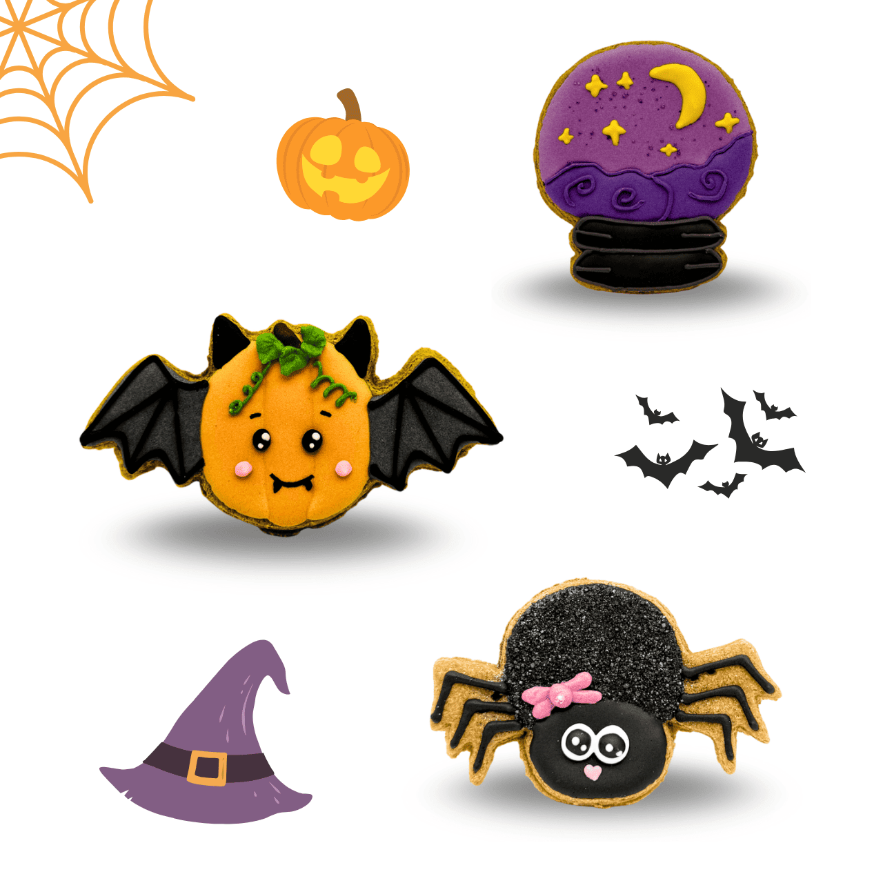 Biscotti Candy Horse venduti singolarmente a forma zucca con ali di pipistrello, ragno e sfera di cristallo ricoperti di glassa reale.