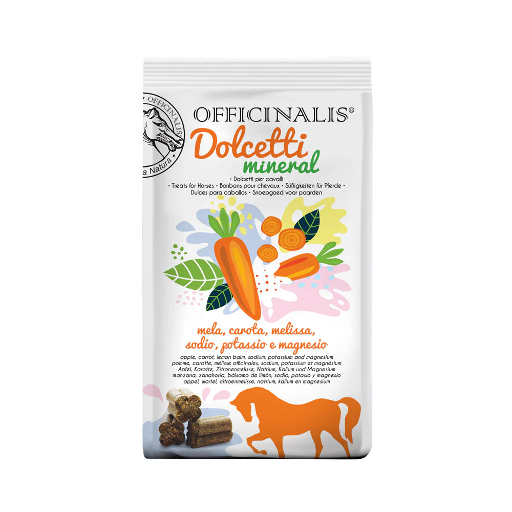 Componenti: Erba medica (Medicago sativa L.) disidratata, farina di crusca di grano, polpa di barbabietola disidratata, fruttosio, melasso di canna da zucchero, lievito di birra, farina di estrazione di soia, Carota in polvere 2%, sodio cloruro 2%, Mela in polvere 2%, Melissa (Melissa officinalis L.) in polvere 1%, potassio sorbato 1%, magnesio cloruro 0,44%.