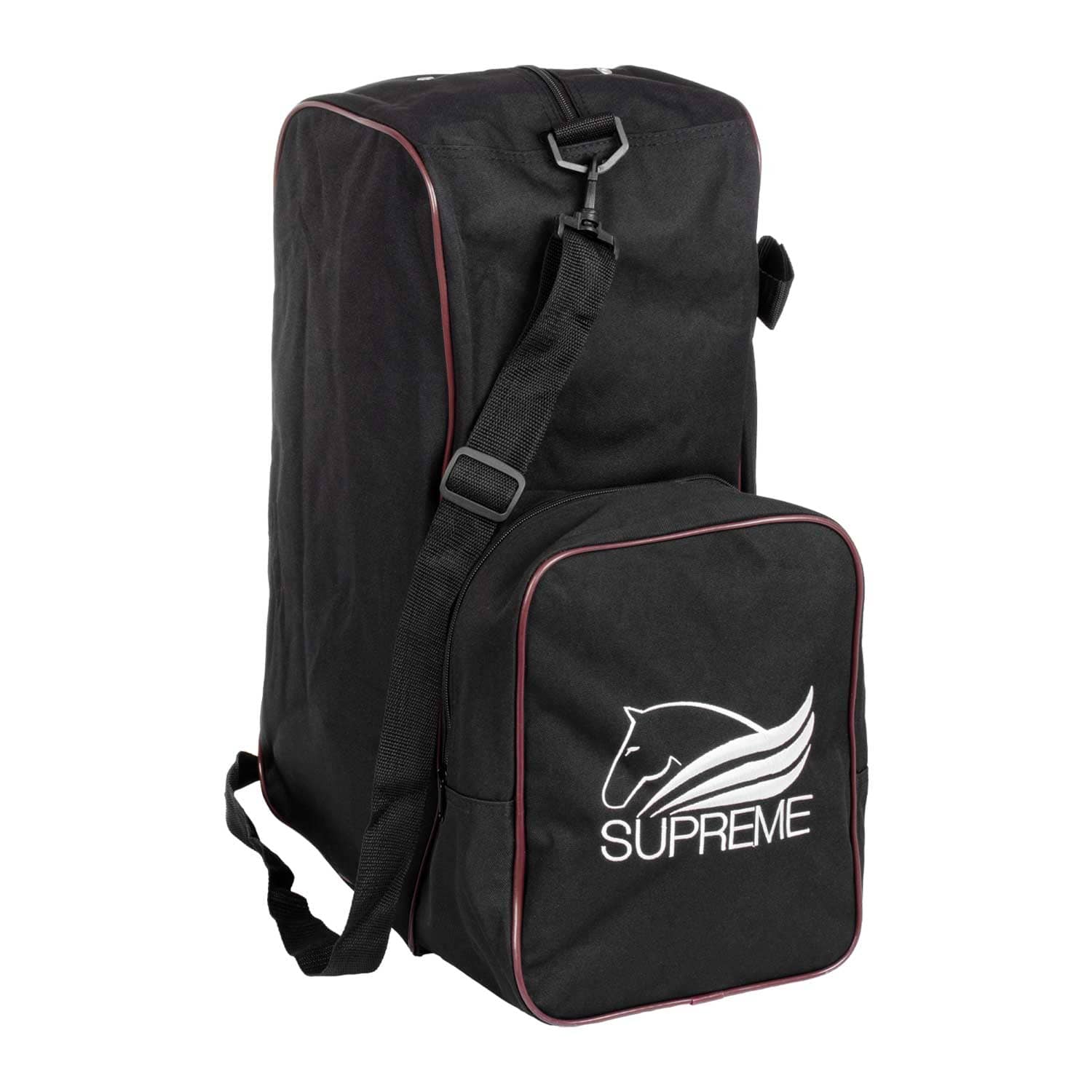 Comoda e pratica borsa per riporre gli stivali e il casco per equitazione. Disponibile nel colore nero e profilo bordeaux con logo 'Supreme'.