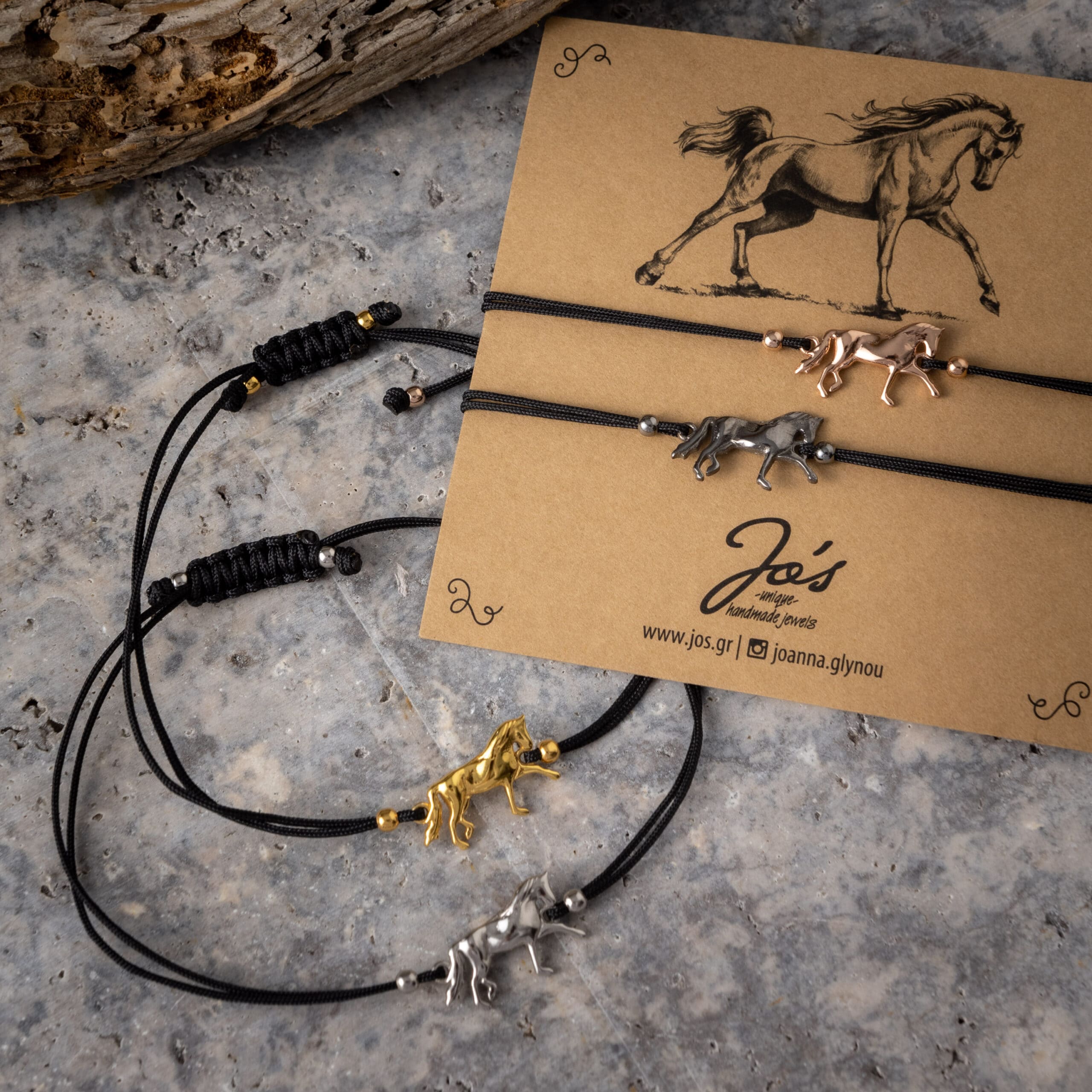 Braccialetto in corda con ciondolo in argento 925 che raffigura un cavallo durante una ripresa di dressage.