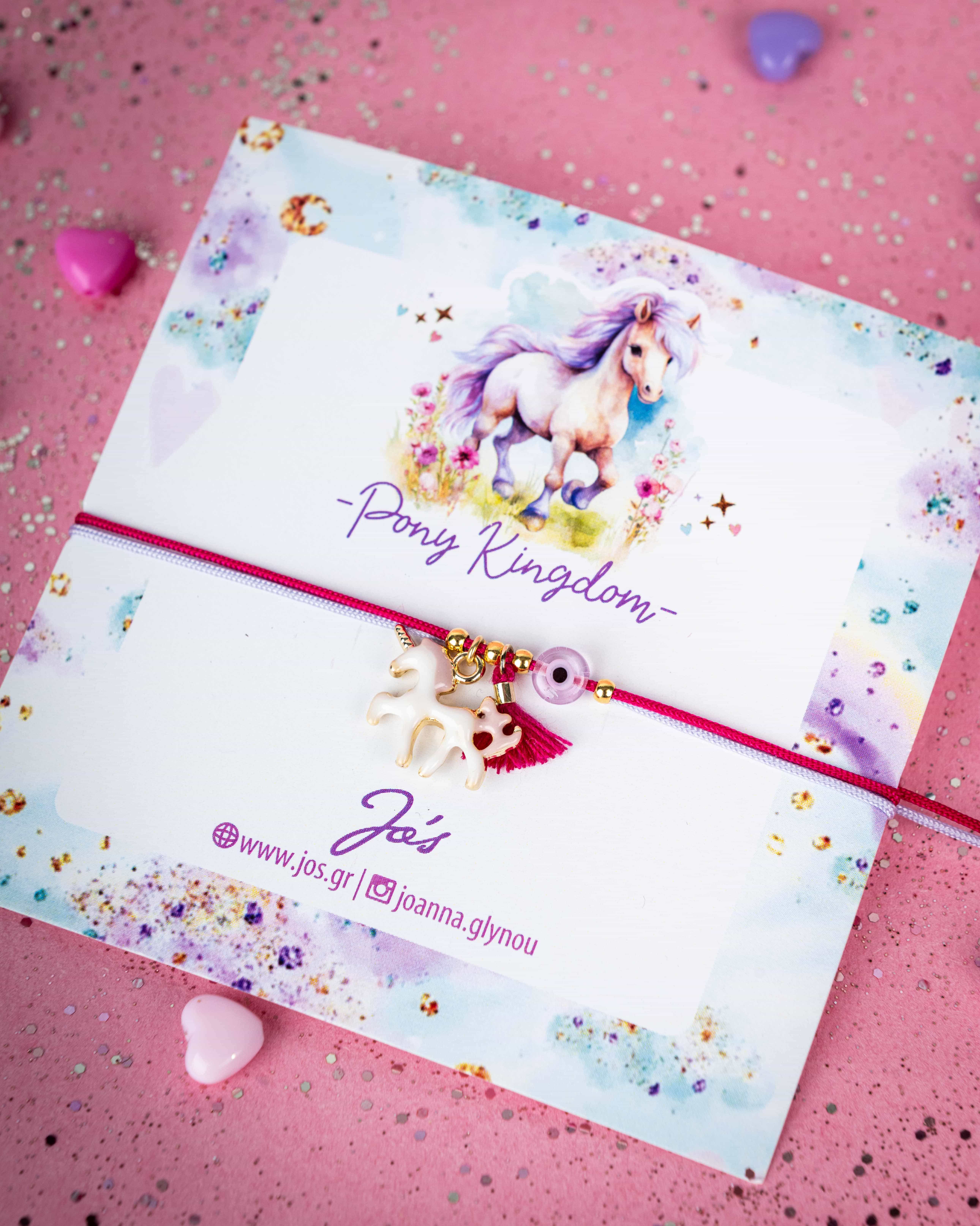 Braccialetto con cordino colorato lilla o fucsia e charm cavallo smaltato accompagnato da una perlina a forma di occhio greco per un tocco di colore e protezione.