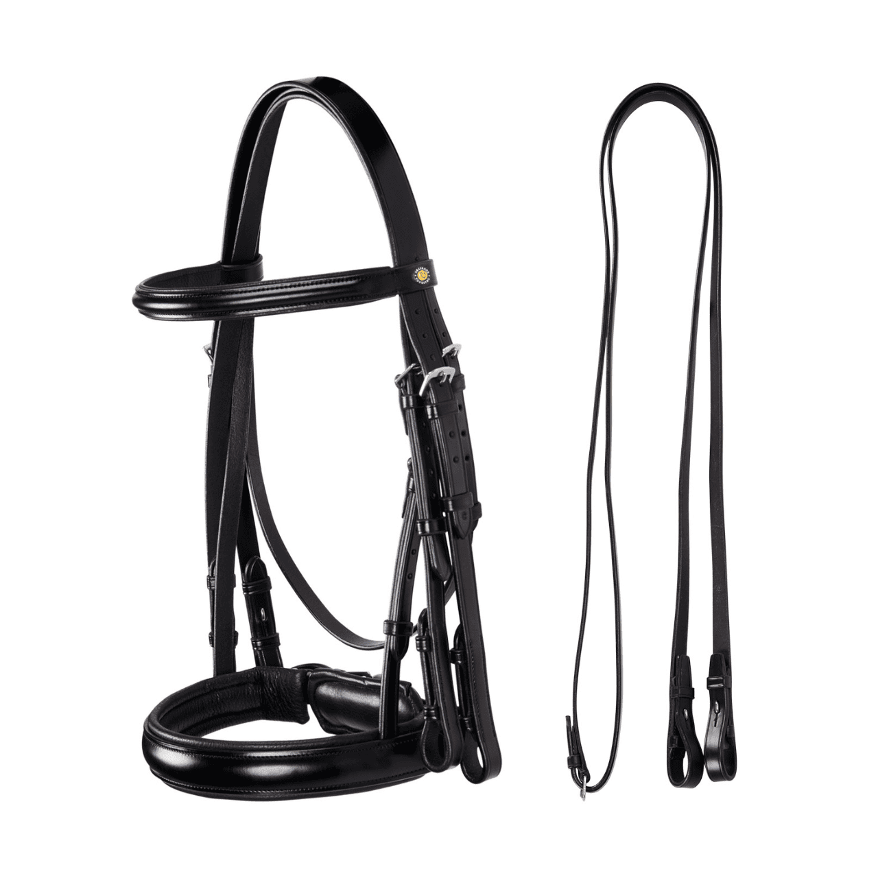 Briglia da dressage in cuoio italiano di alta qualità con chiusura pull-back, completa di doppie redini in cuoio liscio.