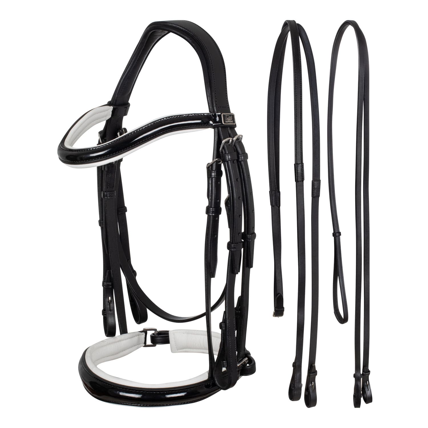 Briglia da dressage in cuoio di alta qualità con imbottitura interna bianca. Completa di redini.
