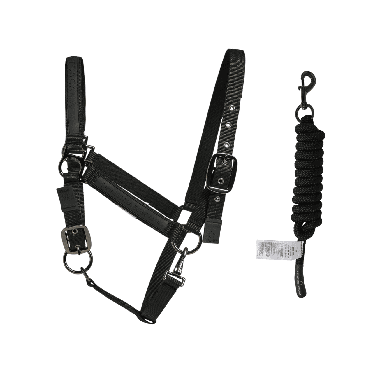 Set composto da capezza e lunghina di colore nero di Cavalleria Toscana. La capezza è realizzata in robusto nylon di alta qualità e garantisce durabilità e resistenza nel tempo. Il design include fibbie regolabili che permettono un adattamento perfetto e confortevole al muso del cavallo.