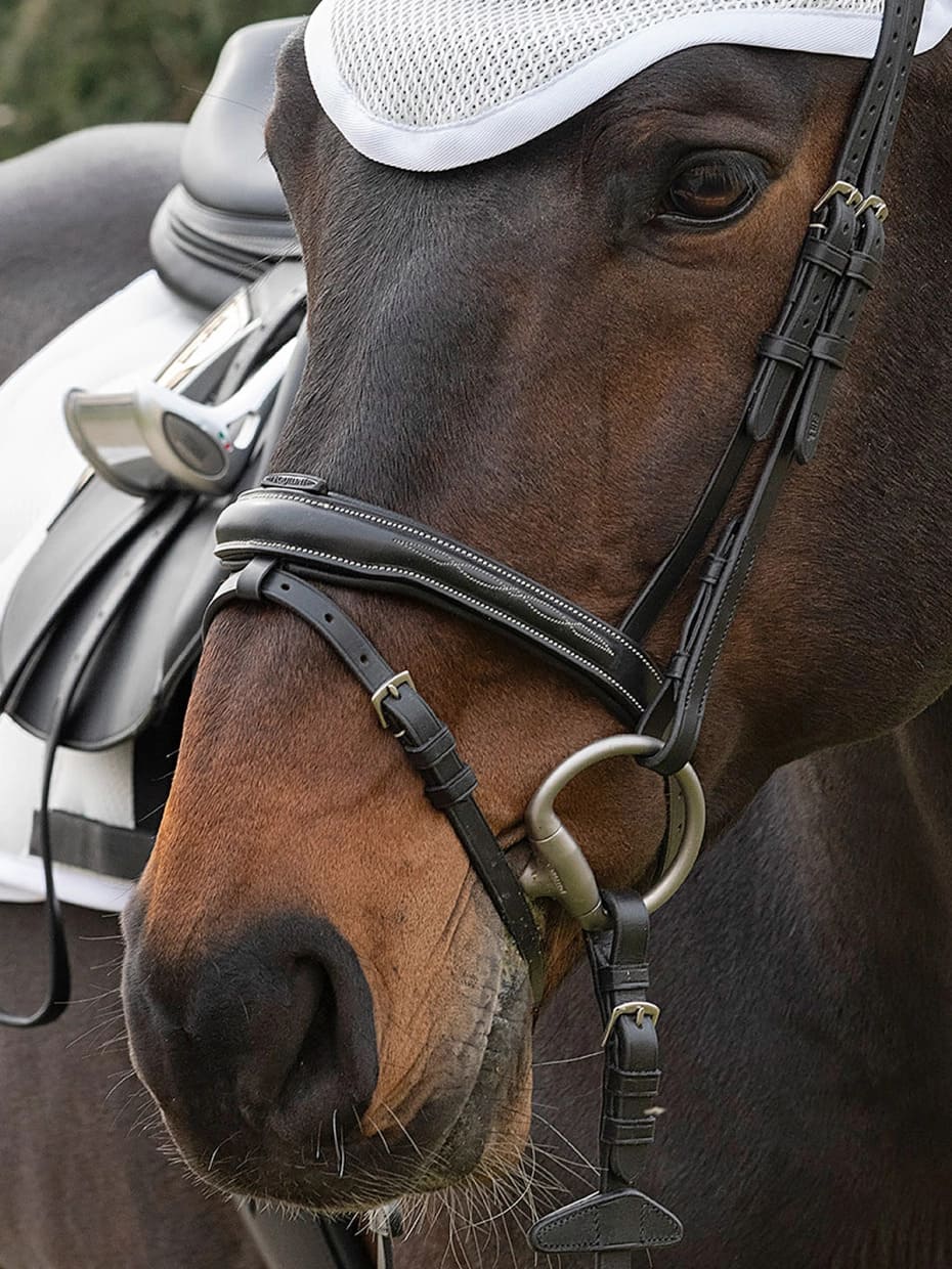 Elegante capezzina con inserto in gomma removibile e passante per chiudibocca. Presenta dettagli con cuciture a contrasto ed è disponibile in nero e marrone, full e cob.