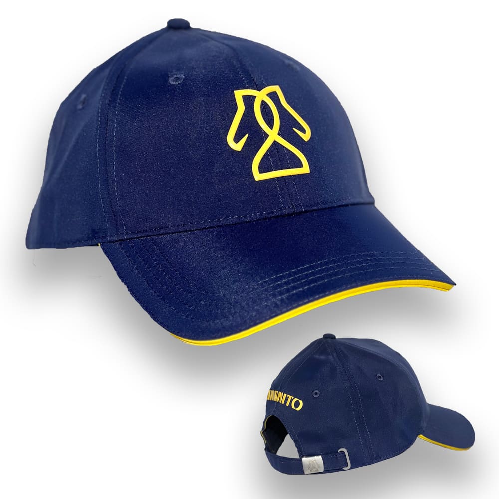 Cappellino unisex blu con logo frontale simbolo Infinito giallo.