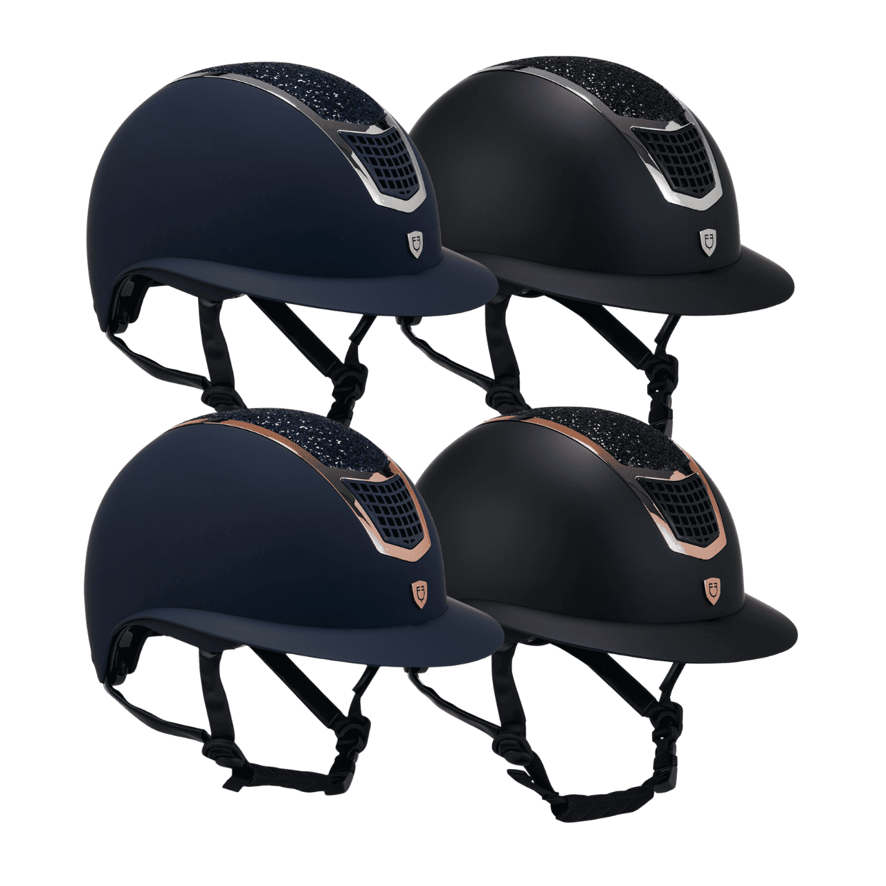 La visiera larga offrire un’ulteriore protezione dai raggi del sole. La calotta esterna è opaca, impreziosita dall'applicazione di brillantini, tono su tono, e da targhetta con logo Equestro.