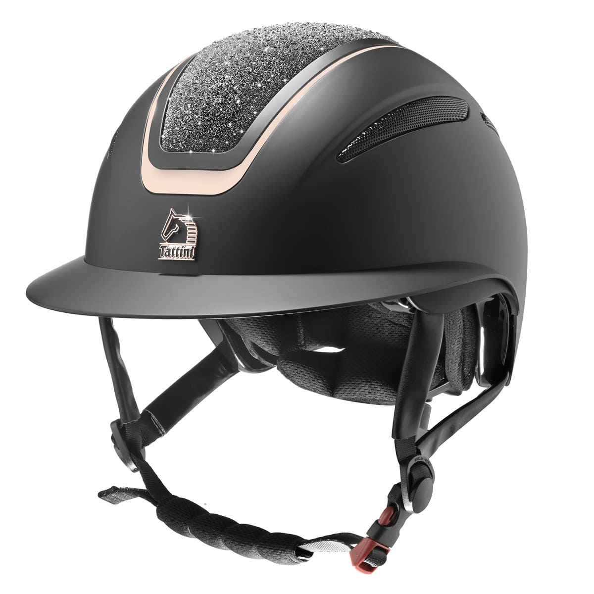 Casco Tattini modello Nettuno con visiera larga, glitter e profili oro rosa.