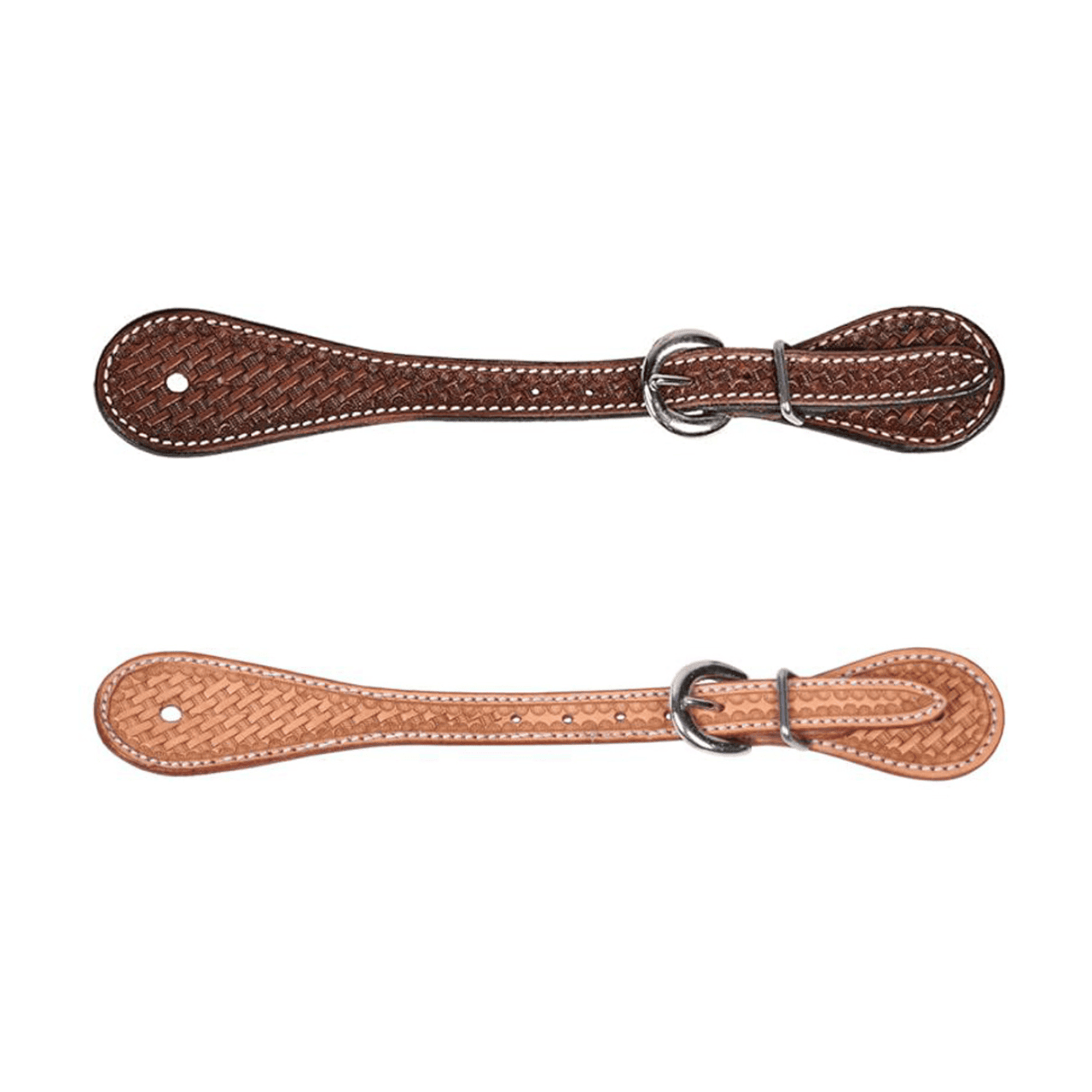 Cinturini per speroni western realizzati in pelle con motivo intrecciato stampato e ferramenta in acciaio inossidabile antiruggine.