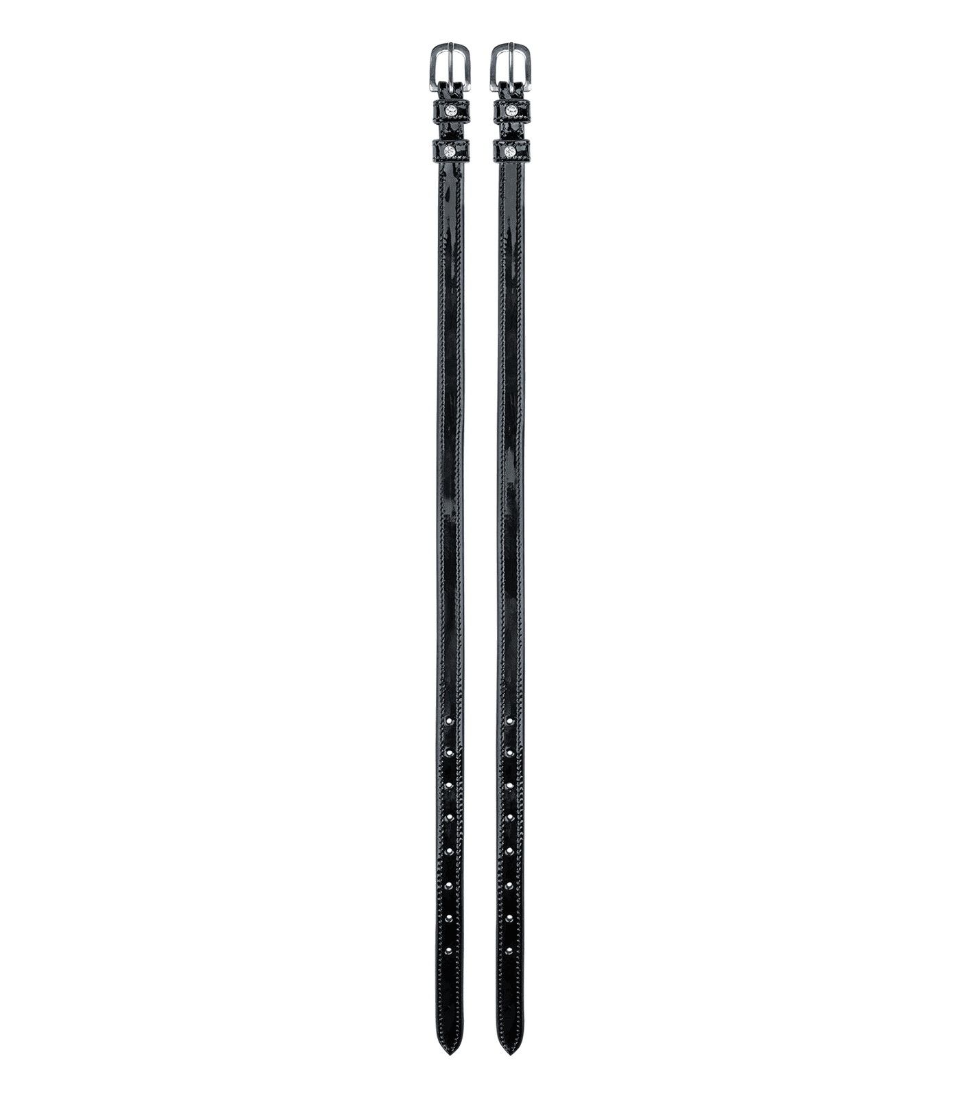 Cinturini per speroni in pelle verniciata con un cristallo su ogni occhiello.