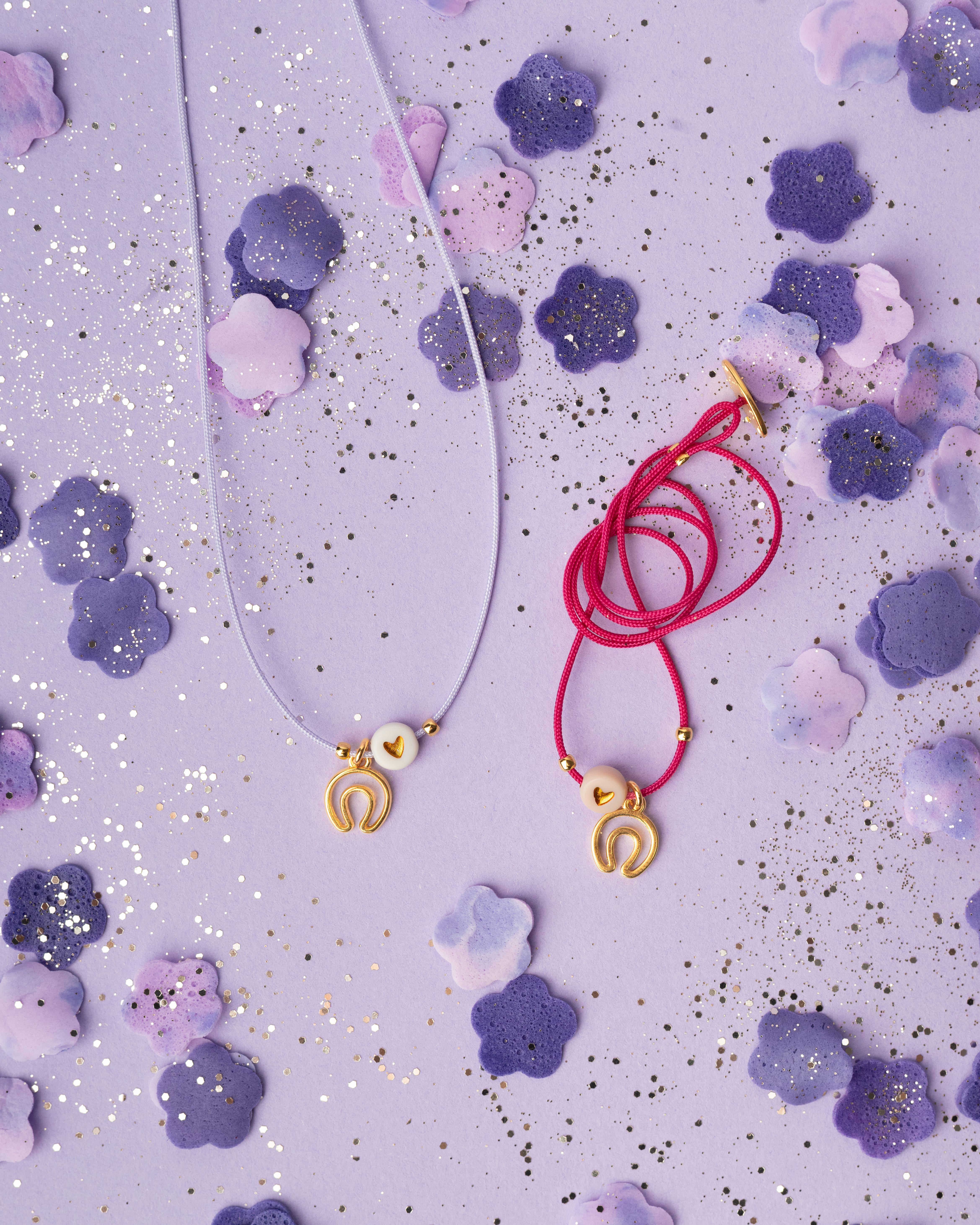 Collana con cordino colorato e charm ferro di cavallo dorato accompagnato da perla con piccolo cuore inciso.