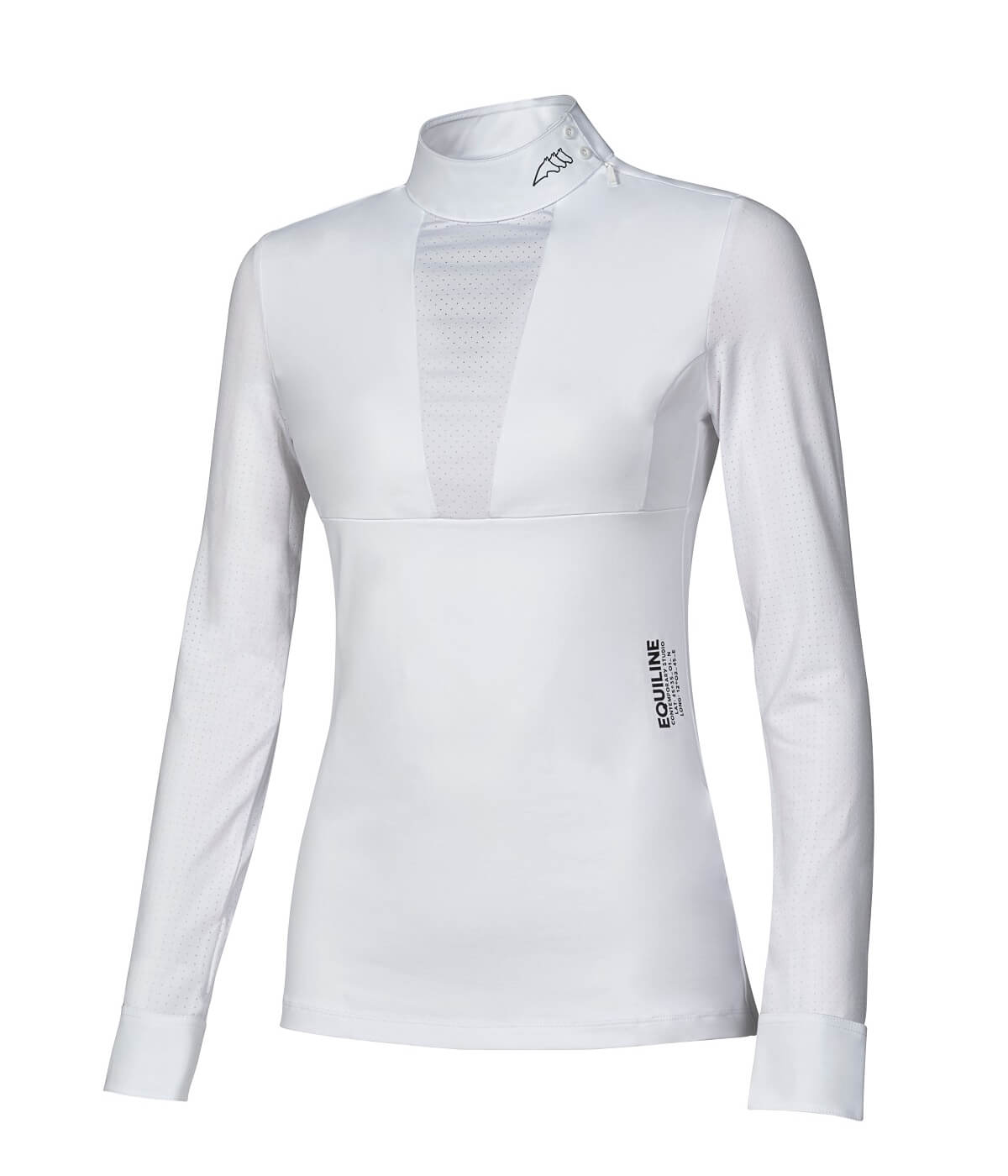 Coreana da donna a maniche lunghe Equiline modello Charmianc realizzata in tessuto tecnico con colletto alla coreana con cerniera e bottoni automatici laterali, inserti traspiranti su parte anteriore e laterale.