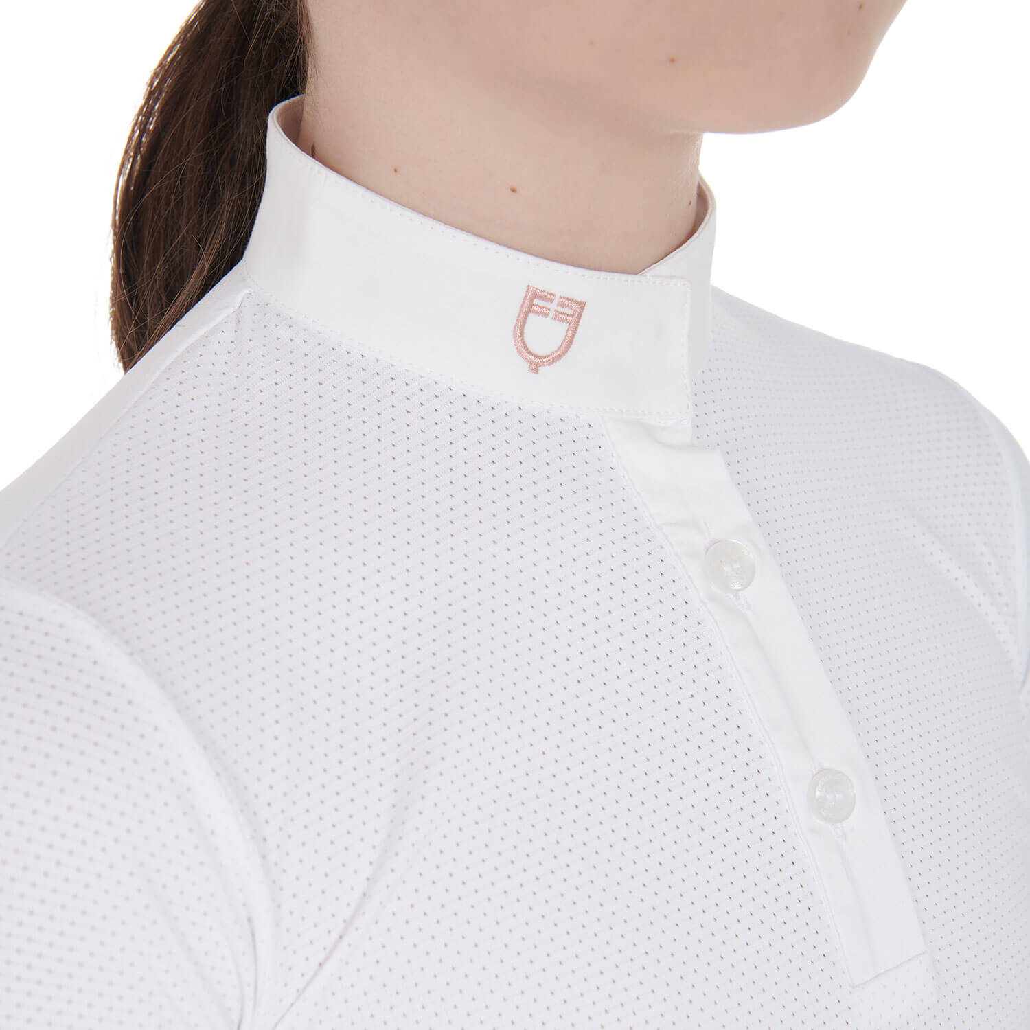 Coreana bambina Equestro bianca con logo ricamato sul colletto in colore rosa.