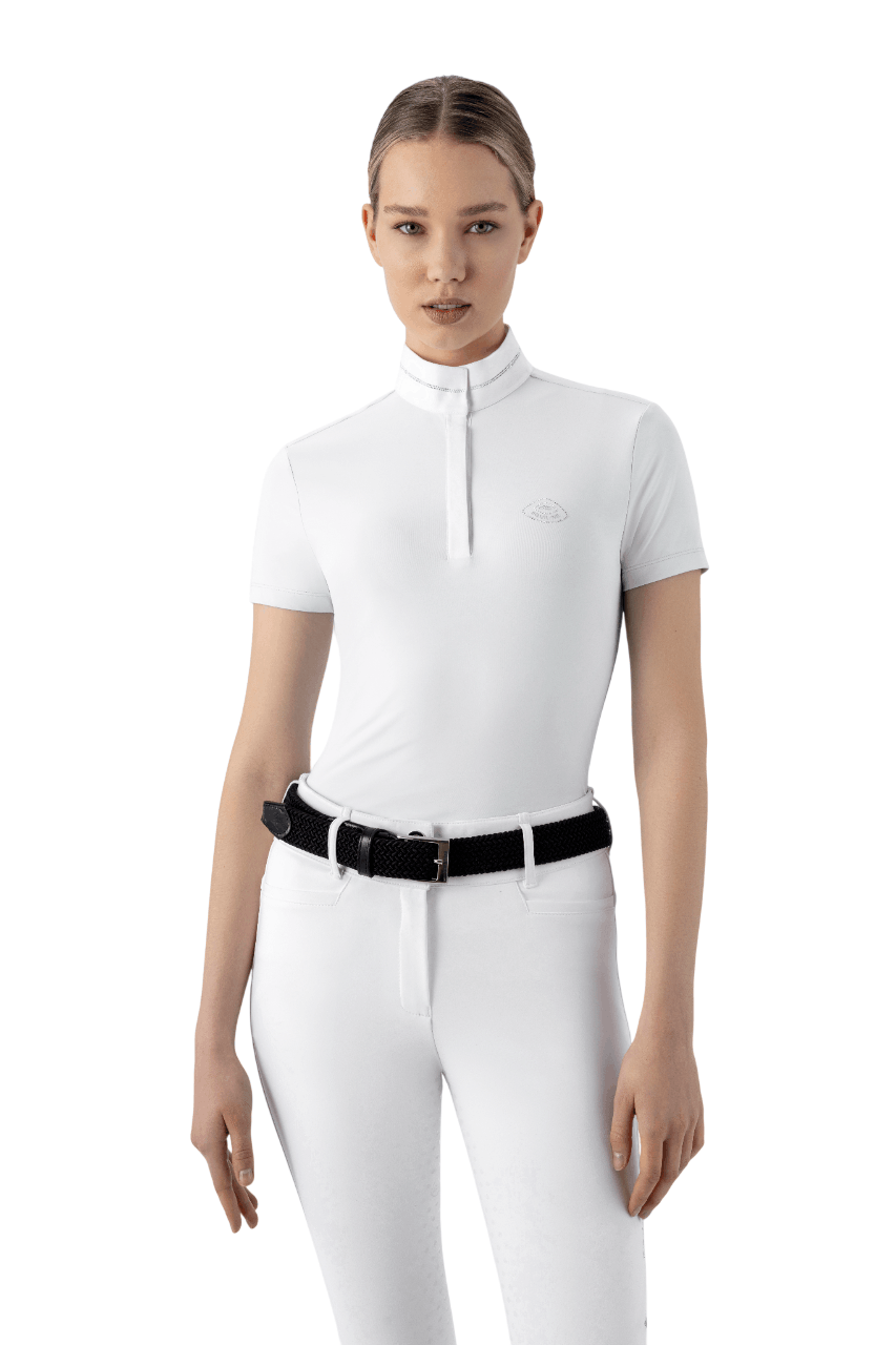 Coreana bianca da competizione con microborchie sul colletto e sul logo appartenente alla collezione primavera-estate 2026 di Equiline.