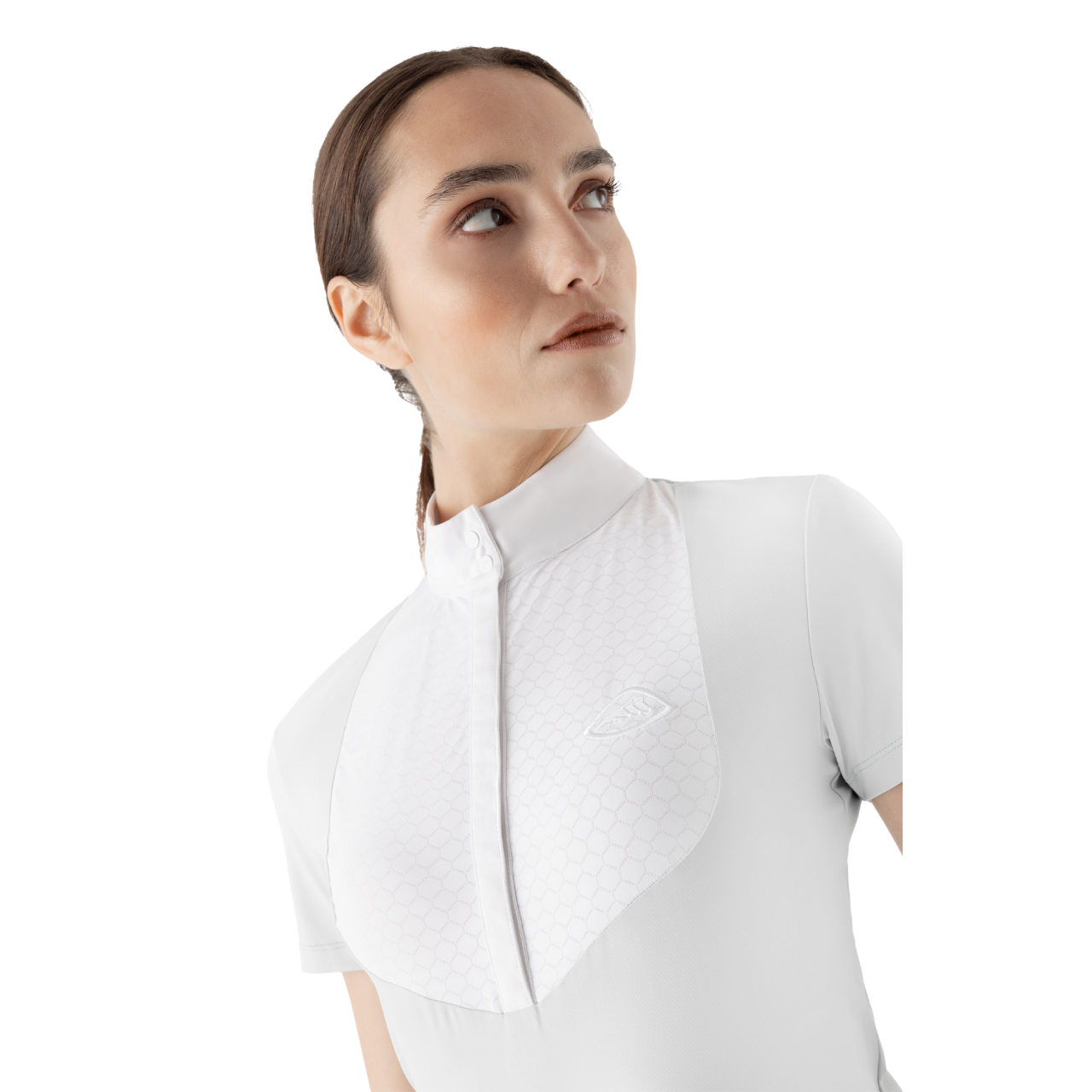 Coreana da competizione da donna a maniche corte realizzata in tessuto elasticizzato, traspirante e rinfrescante, con asciugatura rapida e protezione solare UPF 30+, dotata di bottoni a patta nascosti e logo bianco sul petto.
