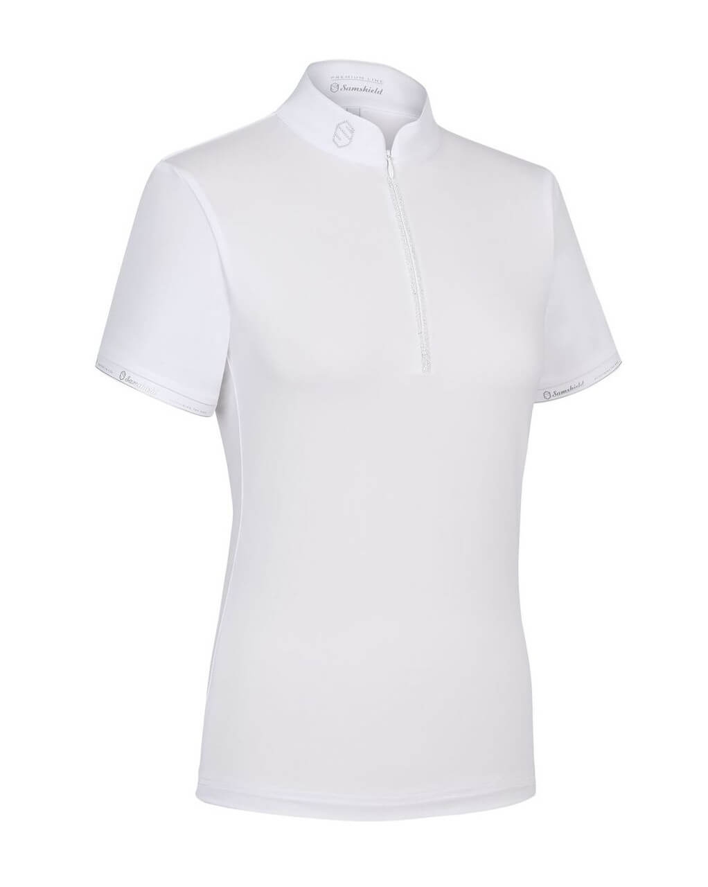 Deliziosa coreana da competizione a maniche corte con colletto a vista con logo Samshield a pois metallici e cerniera nascosta a un quarto con splendido rivestimento in tessuto di cristalli Swarovski.