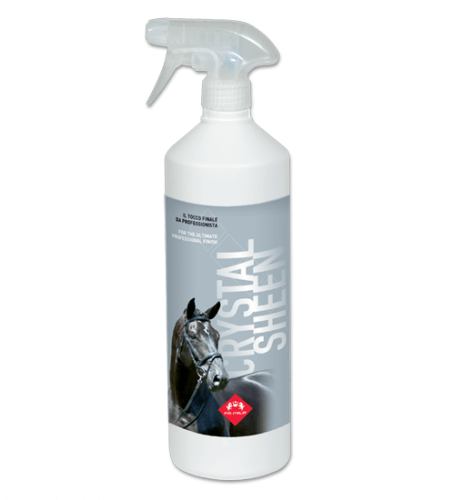 Crystal Sheen è un prodotto lucidante e sgrovigliante per coda, manto e criniera con brillantini argentati.