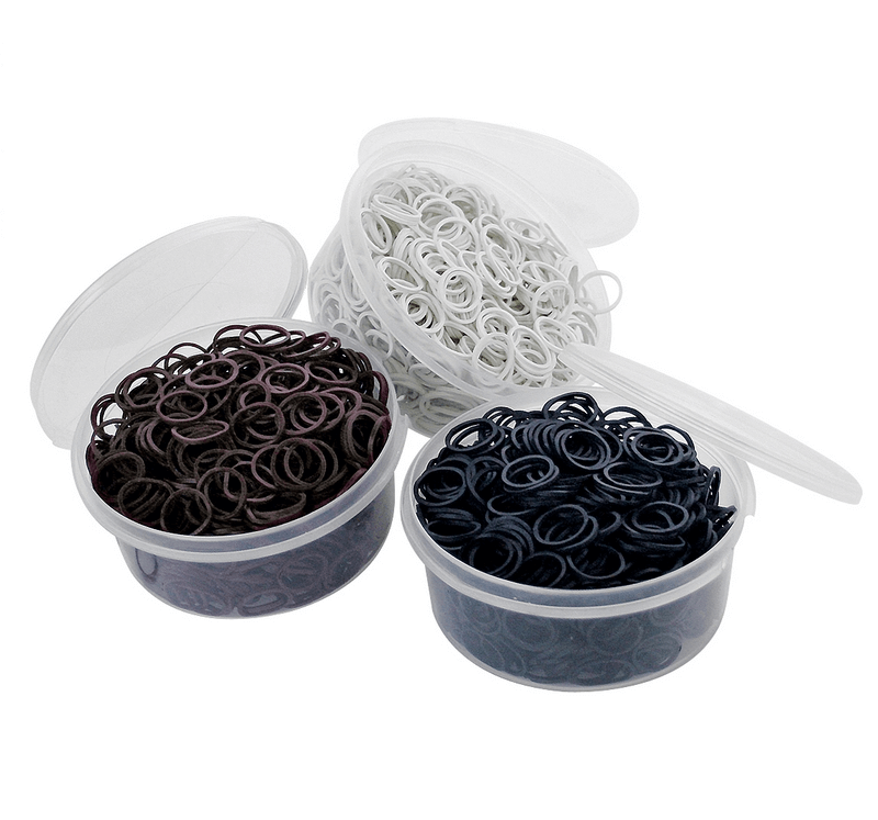 Barattolo richiudibile contenente elastici per coda e criniera da 1000 pezzi.