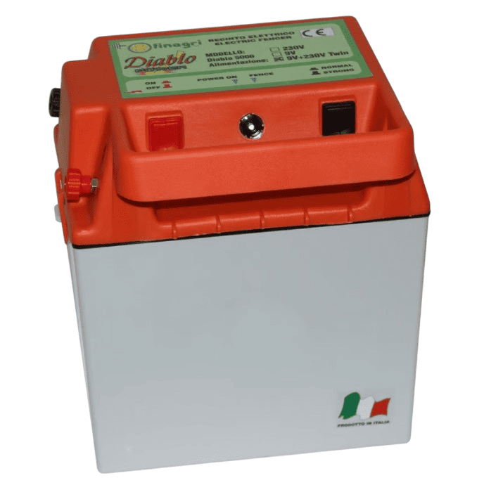 Elettrificatore a doppia alimentazione, funziona con pile a secco da 9v da 55Ah o 90Ah o con trasformatore, le due alimentazioni possono essere impiegate singolarmente.