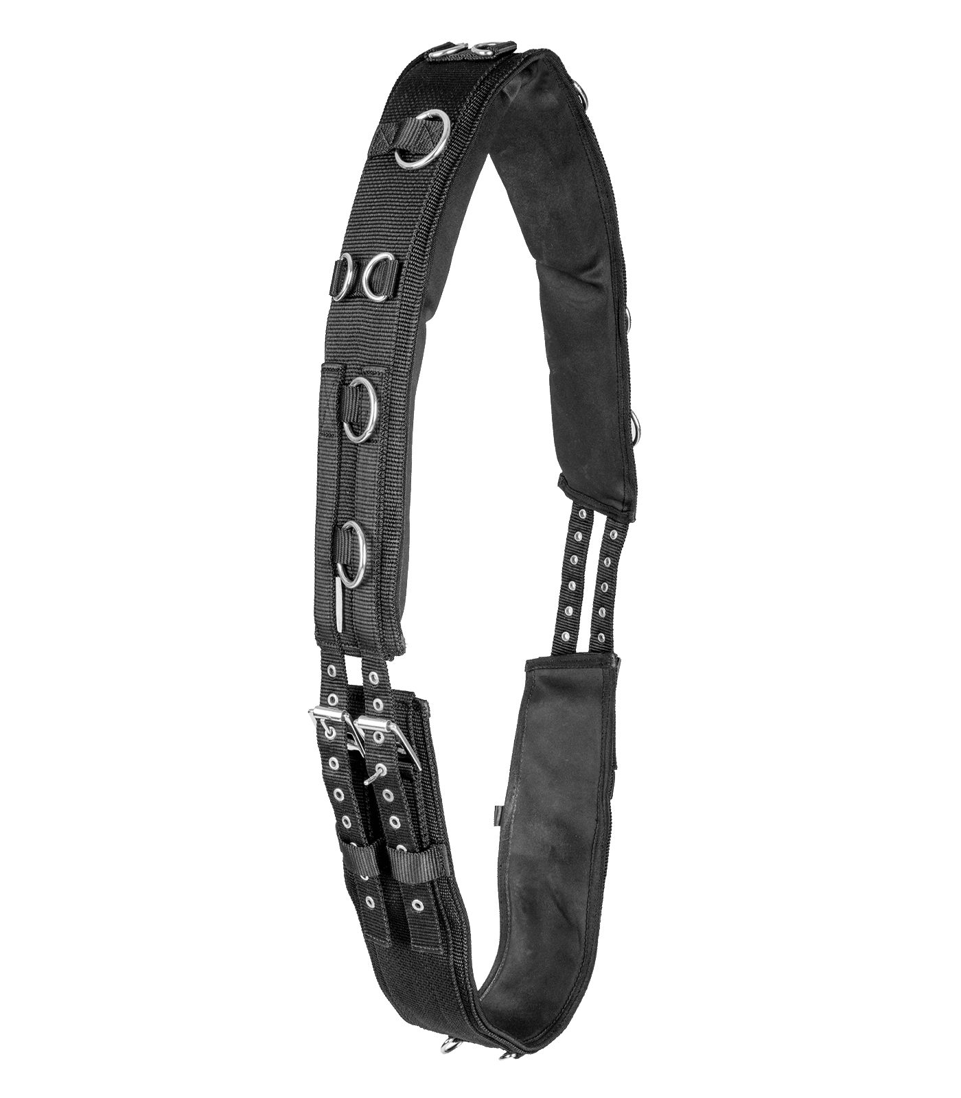 Si adatta facilmente alla pancia grazie alle due fibbie a rulli. Con 12 anelli per il comando singolo. Con fibbiera color argento