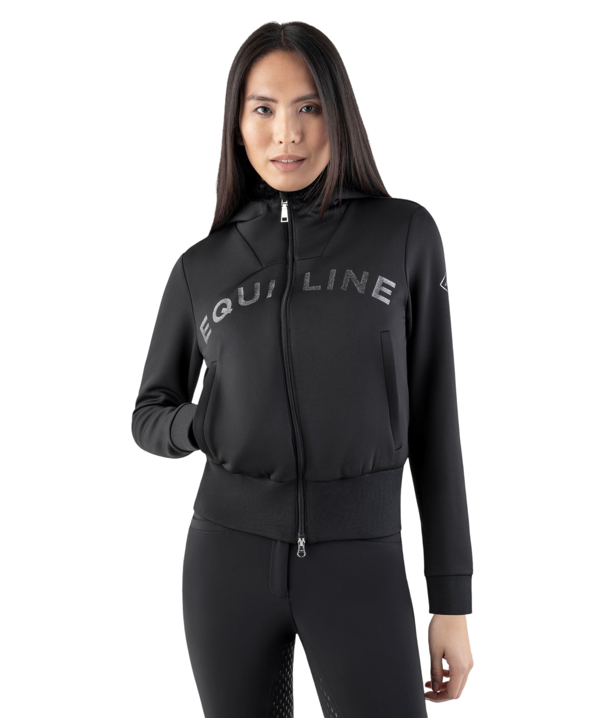 Dotata di zip a doppio cursore e due tasche con zip per praticità, è rifinita con morbide costine su polsini e fondo per una vestibilità aderente. Il logo Equiline glitterato su petto e spalla aggiunge un tocco di elegante raffinatezza.