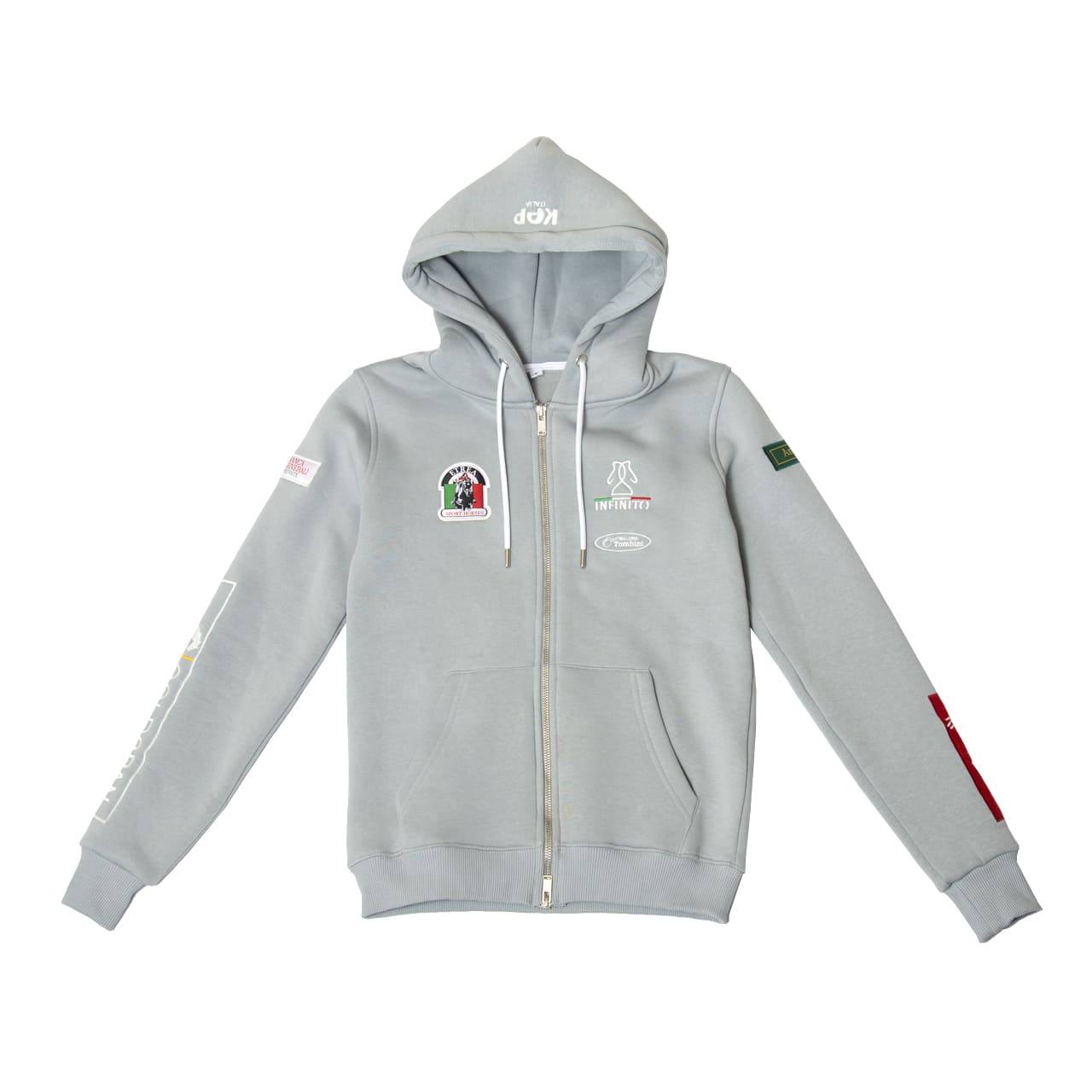 Felpa Etrea da bambino (unisex) con cerniera, felpata internamente, maniche set-in, tasca a marsupio, nastro di rinforzo al collo, cappuccio a doppio strato con cordoncino bianco.