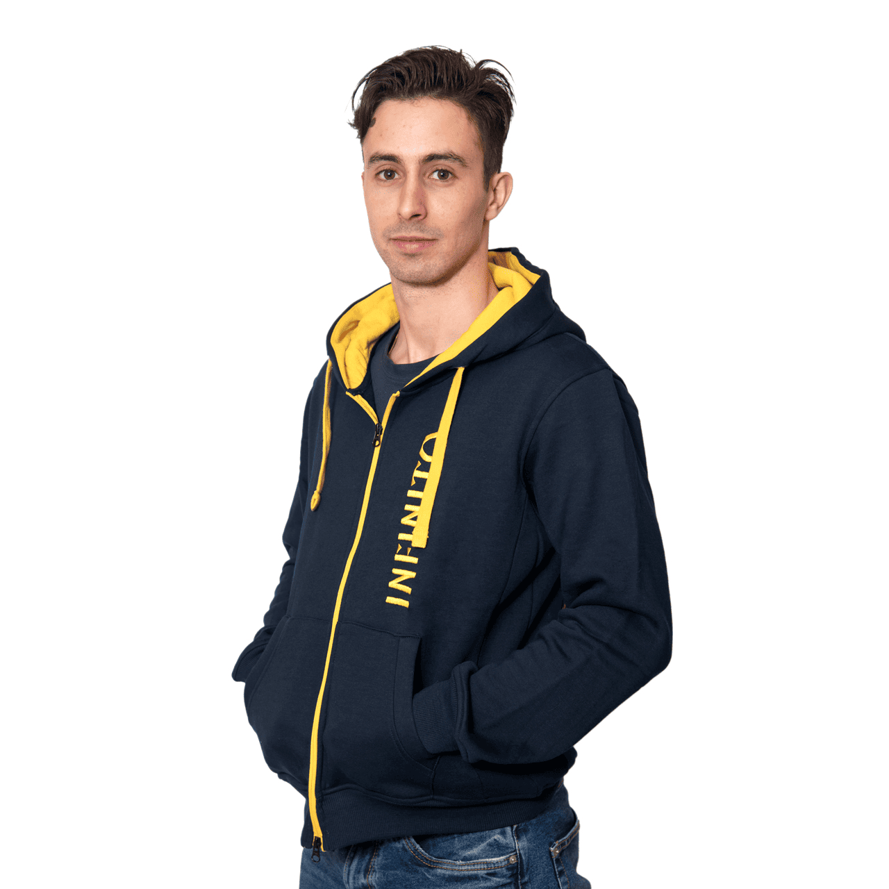 Felpa Infinito unisex blu con cappuccio blu e dettagli gialli.