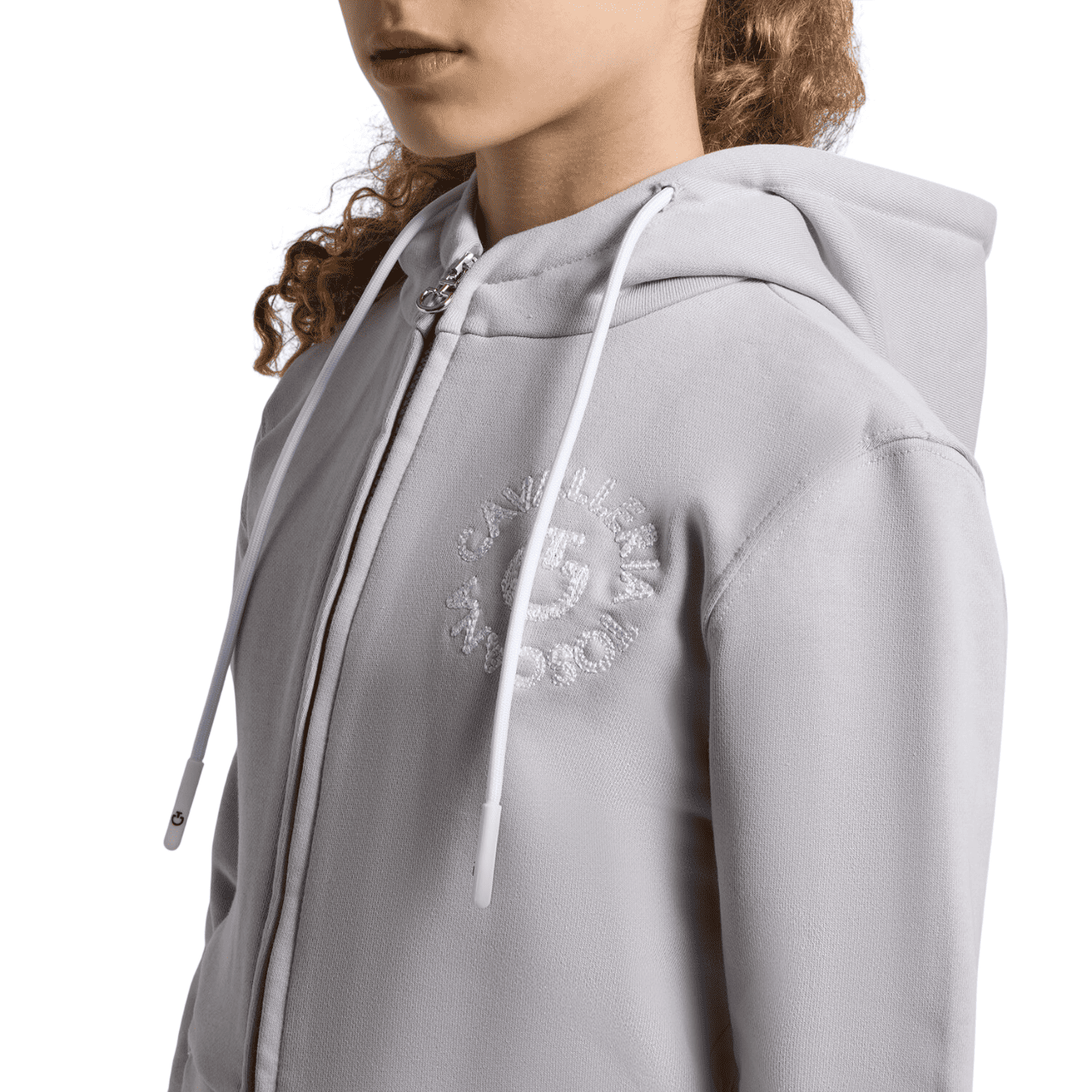 Felpa Junior Cavalleria Toscana grigia chiara con cappuccio e zip centrale a tutta lunghezza realizzata in 100% cotone.