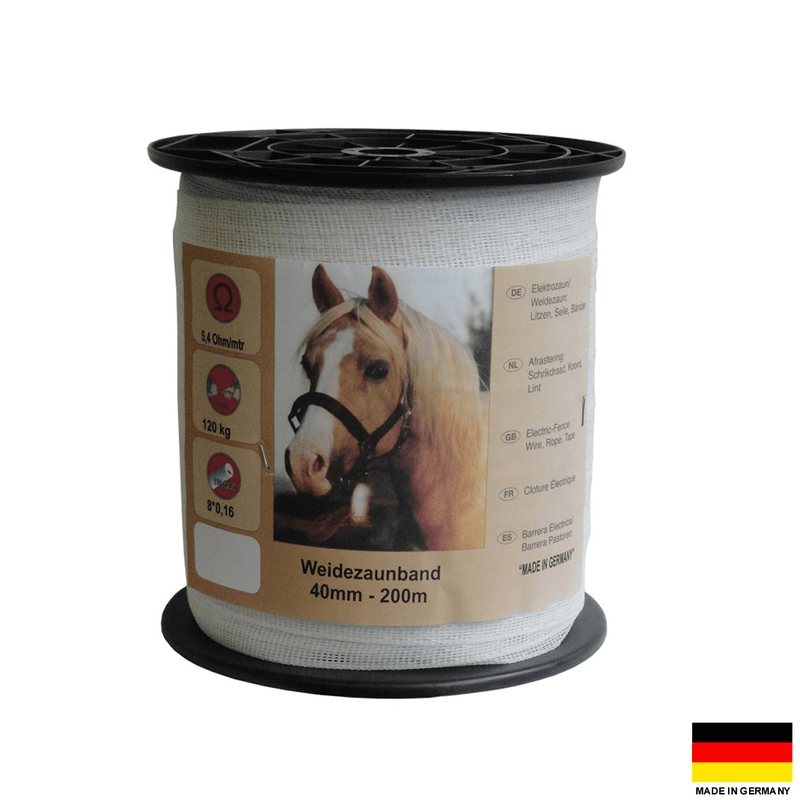 Fettuccia da 4 cm con all'interno 8 fili in acciaio inox, bobina da 200 m, colore bianco.