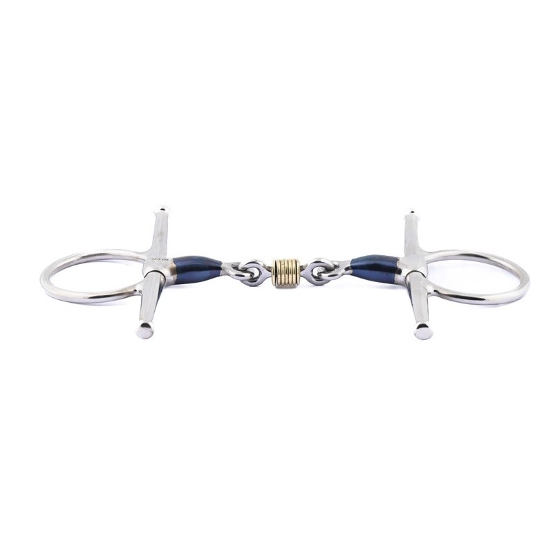 Effetto: il filetto agisce direttamente sulla bocca del cavallo senza alcuna leva. Offre il miglior controllo possibile, motivo per cui è così popolare tra i cavalli giovani. Il cannone a doppio snodo rende questo filetto più confortevole in bocca liberando la zona di fastidio sul palato. I filetti in acciaio blu si ossidano a contatto con l'aria e l'umidità. Appare un sottile strato di ruggine dal sapore dolce ,che stimola naturalmente la produzione di saliva. Salivando di più, il cavallo ottiene un maggiore contatto con il filetto. Durante questo processo di ossidazione, il colore cambia in grigio/marrone.
