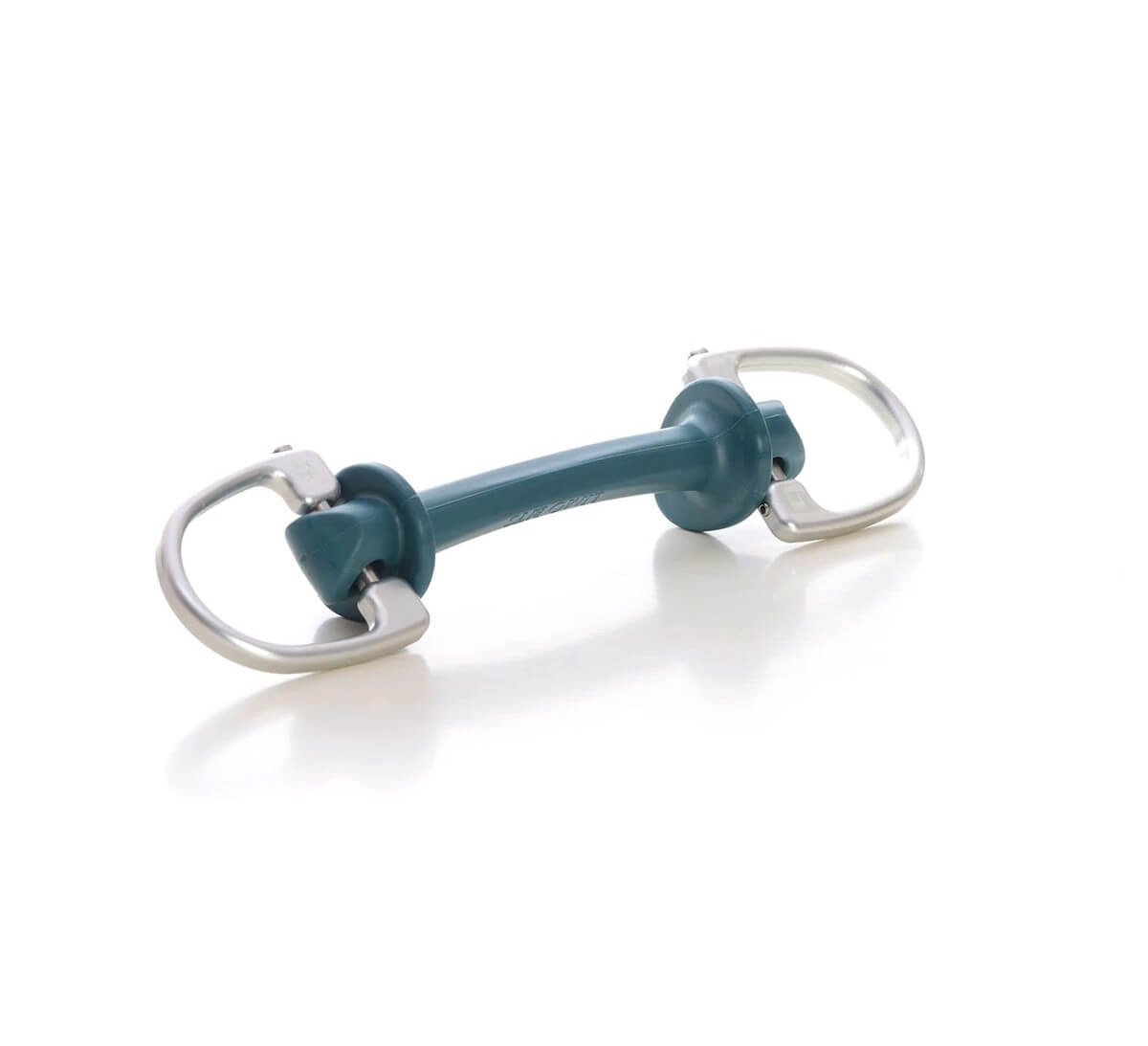 Filetto a D semi-flessibile Makebe realizzato in materiale termoplastico con bocchino a forma esagonale con ampie rondelle laterali che impediscono il pizzicamento del morso sulle commissure labiali e impediscono l'ingestione di aria. I supporti laterali sono unici sul mercato.
