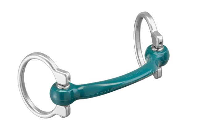 Filetto a oliva Makebe con cannone curvo e flessibile realizzato in materiale termoplastico con bocchino a forma esagonale con ampie rondelle laterali che impediscono il pizzicamento del morso sulle commissure labiali e impediscono l'ingestione di aria. I supporti laterali sono unici sul mercato.
