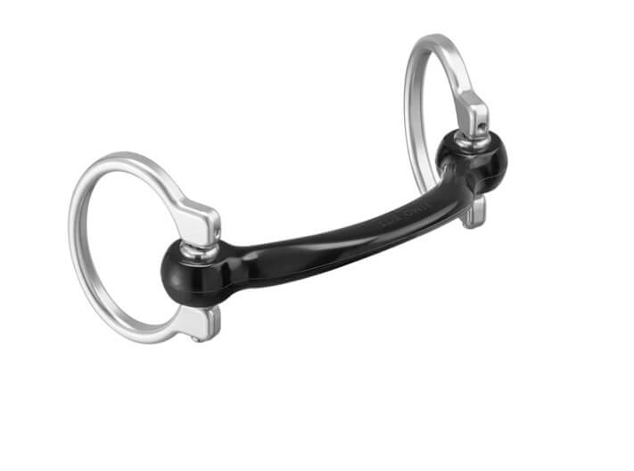 Filetto a oliva Makebe con cannone curvo e rigido realizzato in materiale termoplastico con bocchino a forma esagonale con ampie rondelle laterali che impediscono il pizzicamento del morso sulle commissure labiali e impediscono l'ingestione di aria. I supporti laterali sono unici sul mercato.