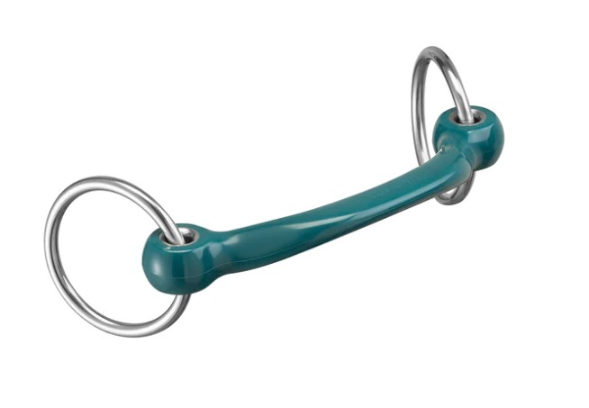 Filetto ad anelli Makebe con cannone curvo flessibile realizzato in materiale termoplastico con forma anatomica che impedisce la pressione sulla lingua e sulle barre del cavallo.