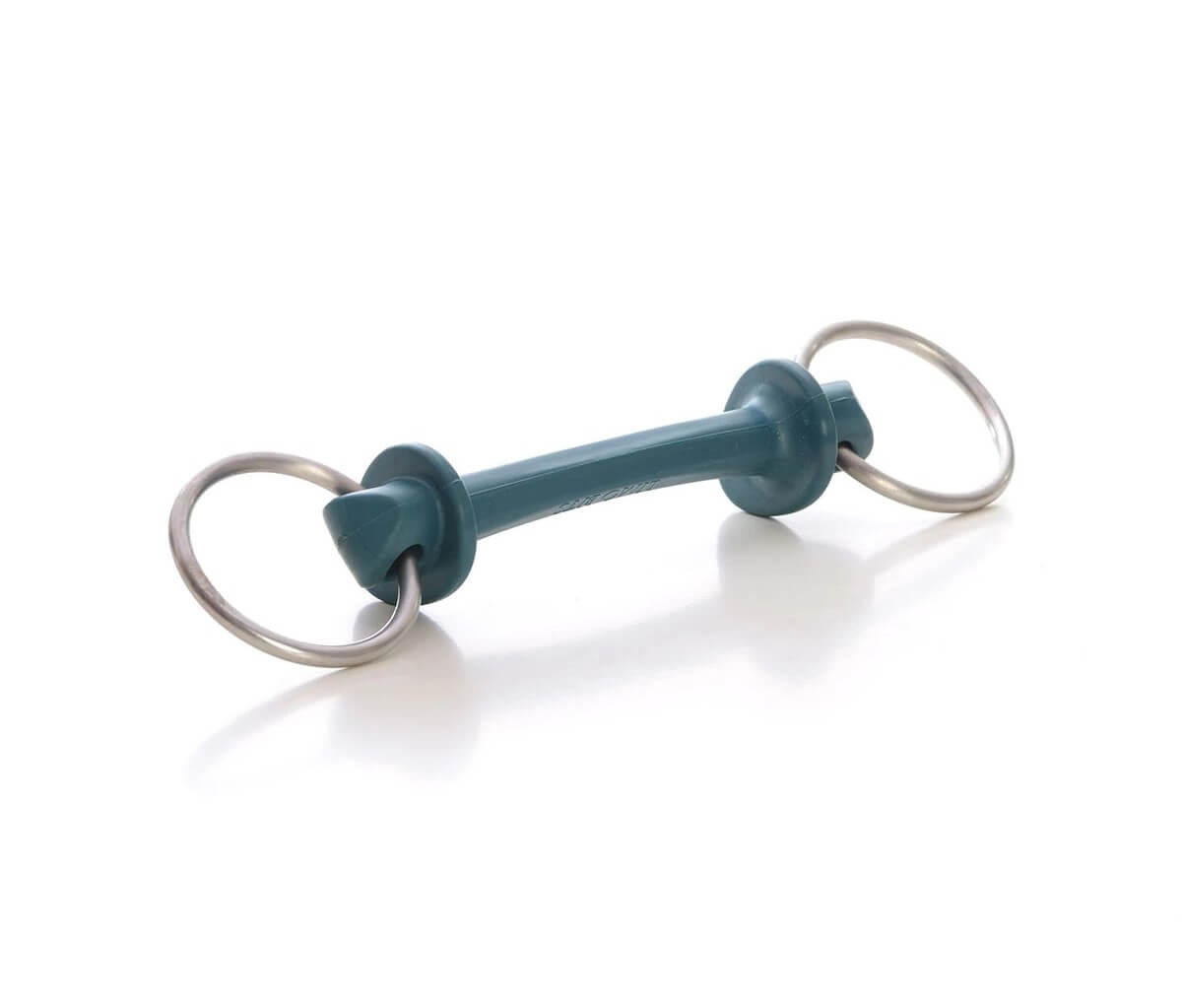 Filetto ad anelli Makebe realizzato in materiale termoplastico con bocchino a forma esagonale con ampie rondelle laterali che impediscono il pizzicamento del morso sulle commissure labiali e impediscono l'ingestione di aria. I supporti laterali sono unici sul mercato.