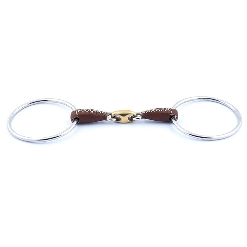 Filetto ad anelli (70 mm) in acciaio inossidabile spezzato in tre con oliva centrale in ottone e cannone (18 mm) rivestito in pelle.