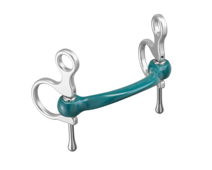 Filetto Baucher Makebe con cannone flassibile curvo e aste realizzato in materiale termoplastico con bocchino a forma esagonale con ampie rondelle laterali che impediscono il pizzicamento del morso sulle commissure labiali e impediscono l'ingestione di aria. I supporti laterali sono unici sul mercato.
