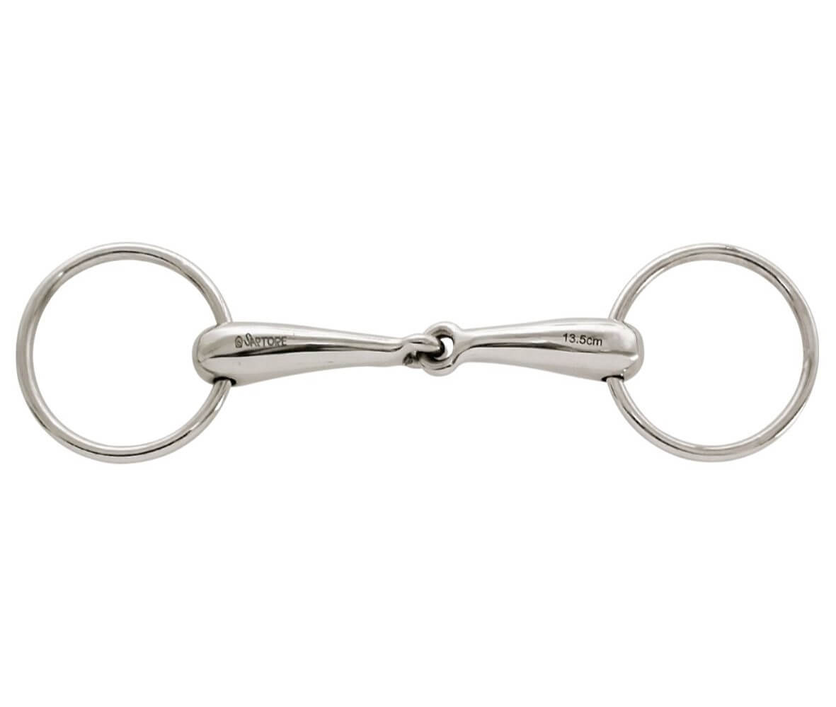 Filetto snodato con imboccatura piena e cannone da 18 mm. Anelli in acciaio inox da 16 mm.