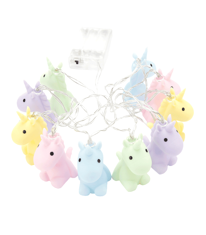 Filo di luci a led composte da 10 unicorni color pastello che si illuminano con una luce calda. Perfetto per decorare la camera dei bambini o il soggiorno.