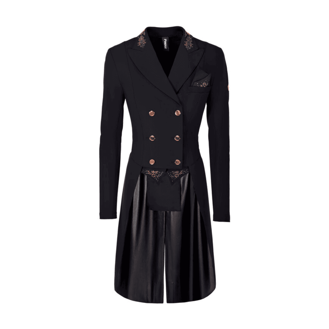 Code foderate in pelle sintetica e pesi integrati per mantenere le code in posizione, eleganti bottoni con gambo al centro davanti e sulle maniche in oro rosé.