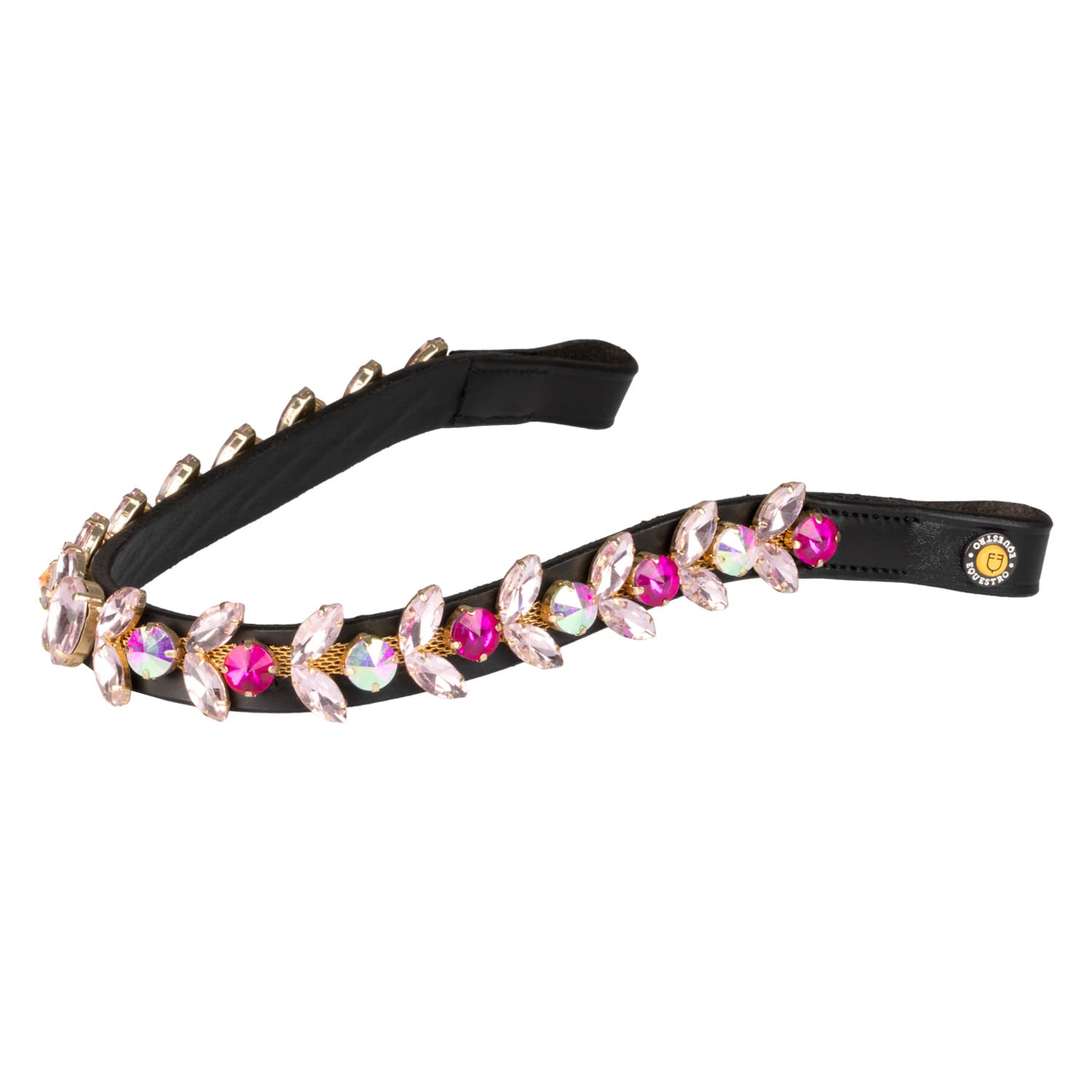 La sua bellezza è ulteriormente esaltata da una fila di cristalli rotondi iridescenti che donano brillantezza ed eleganza alla sommità della testa del cavallo.